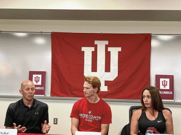 IU Columbus men’s and women’s cross-country coach Tim Hoeflinger, left, speaks at the school’s media day as runners Connor Beatty and Audra McNear look on.
