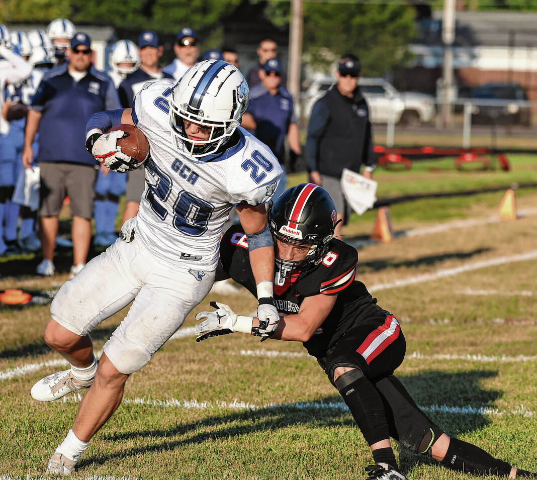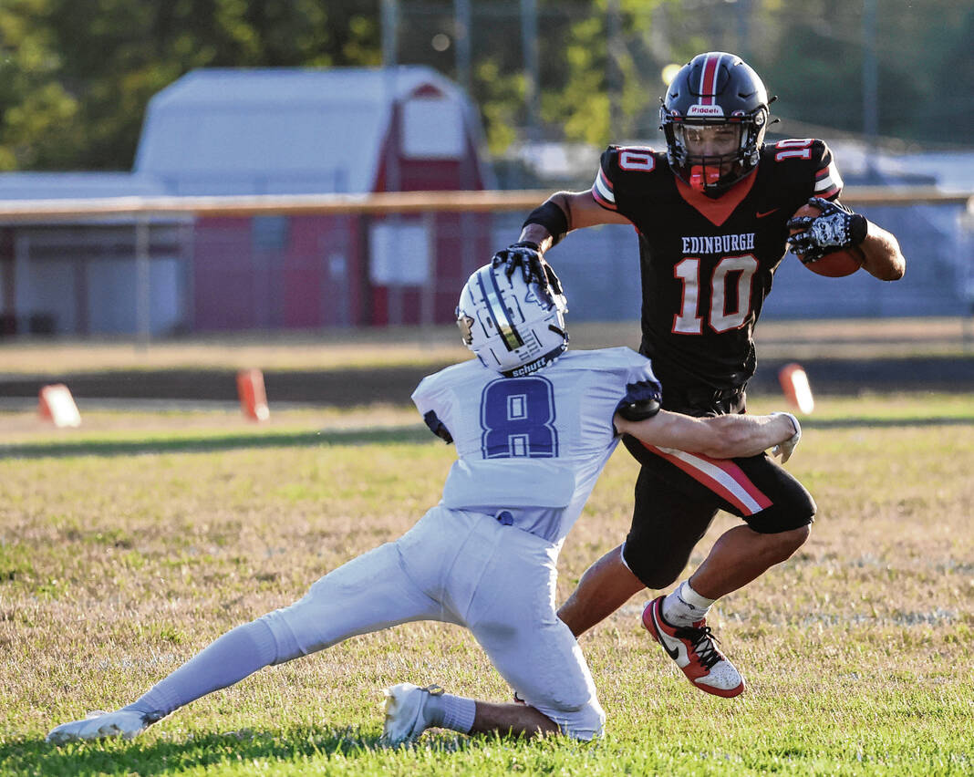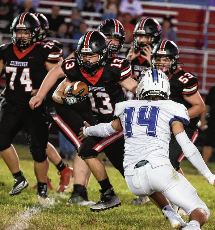 Edinburgh’s Bailey Totten (13) finds a big hole to run through against Greenwood Christian.