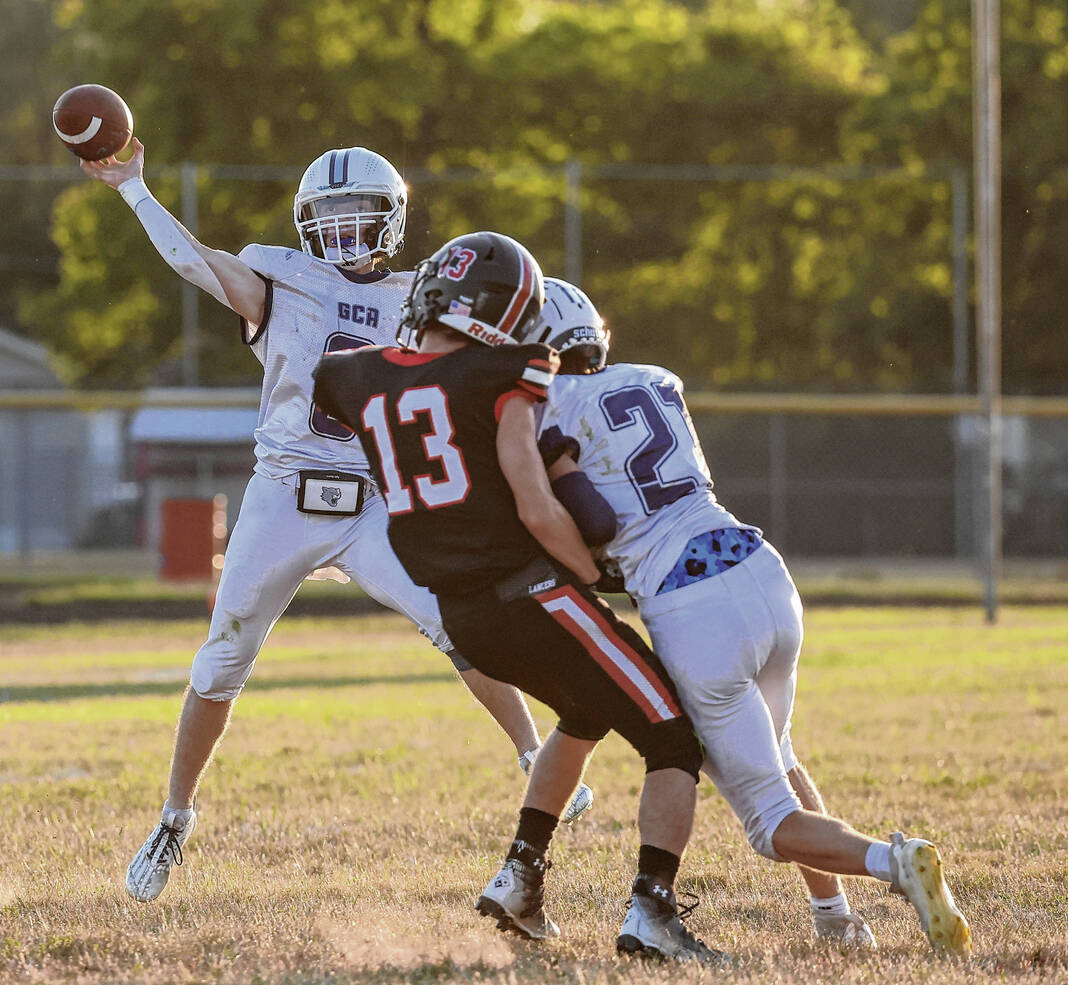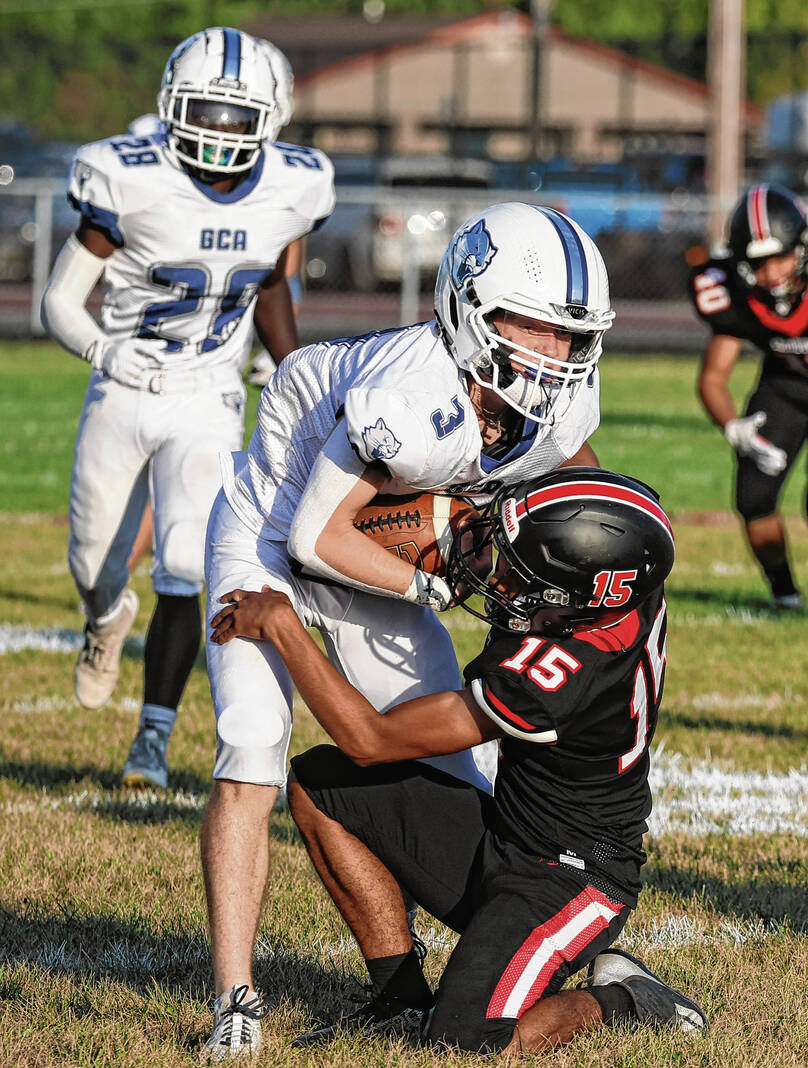 Twice the Cougars took the ball to the Lancer 1-yard line in the first half — and both times, the Lancers thwarted the drives. On the first, Cougar back Nathan Goins was stopped just short of the end zone. It happened again in the second quarter, this time with some help from the Cougars themselves. GCA got to the 1 again, then lost 39 yards thanks to two penalties and two sacks of Trey Dobson. Dobson had thrown an apparent touchdown pass, but a personal foul by the Cougars negated that and instead Greenwood Christian had nothing to show for their drives.