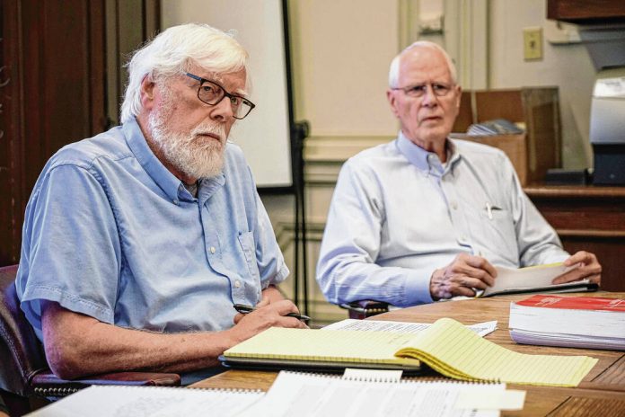 Mike Wolanin | The Republic Bartholomew County Election Board Vice Chairman Mark Kevitt, left, and Chairman James Holland listen to Bartholomew County Democratic Party Chairman Ross Thomas during a hearing challenging Republican Joseph Jay Foyst’s candidacy for Columbus City Council District 6 in the Bartholomew County Clerk’s Office at the Bartholomew County Courthouse in Columbus, Ind., Friday, Aug. 18, 2023.