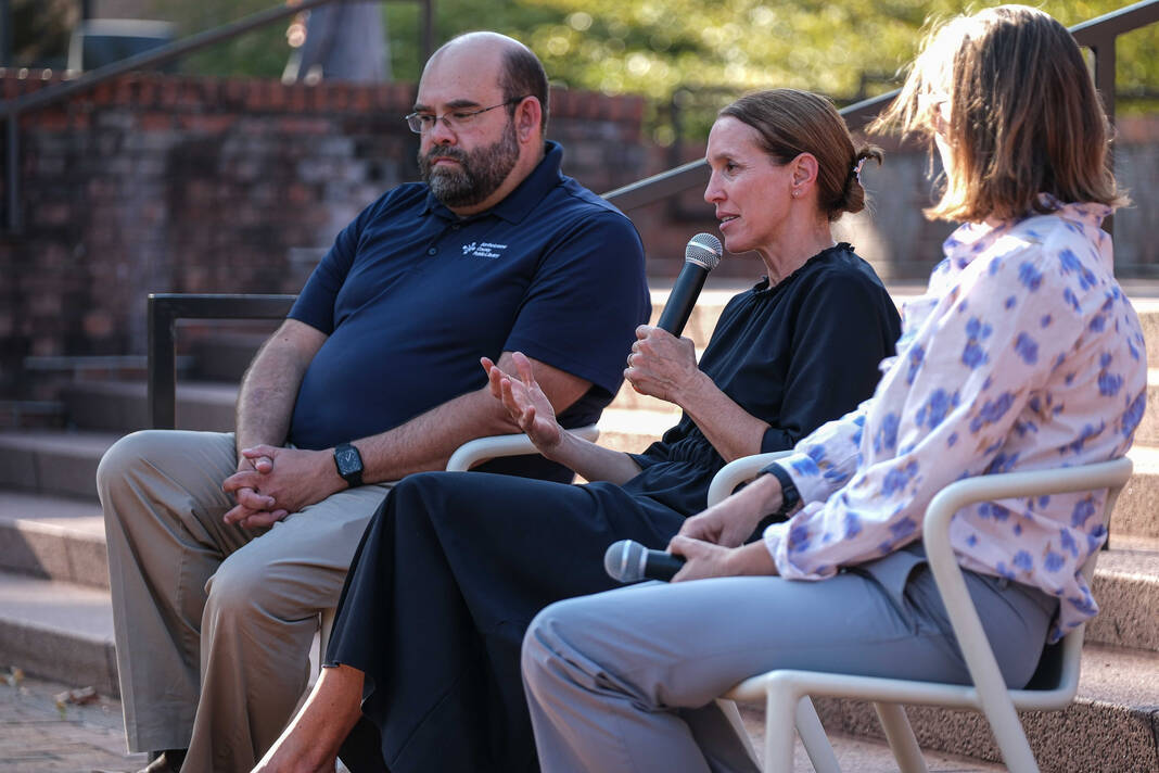 Mike Wolanin | The Republic Jason Hatton, from left, Tatiana Bilbao and Jennifer Dunlop Fletcher take part in a Miller Prize Conversations event at Bilbao’s Exhibit Columbus installation Designed by the Public on the library plaza in Columbus, Ind., Tuesday, Sept. 19, 2023.