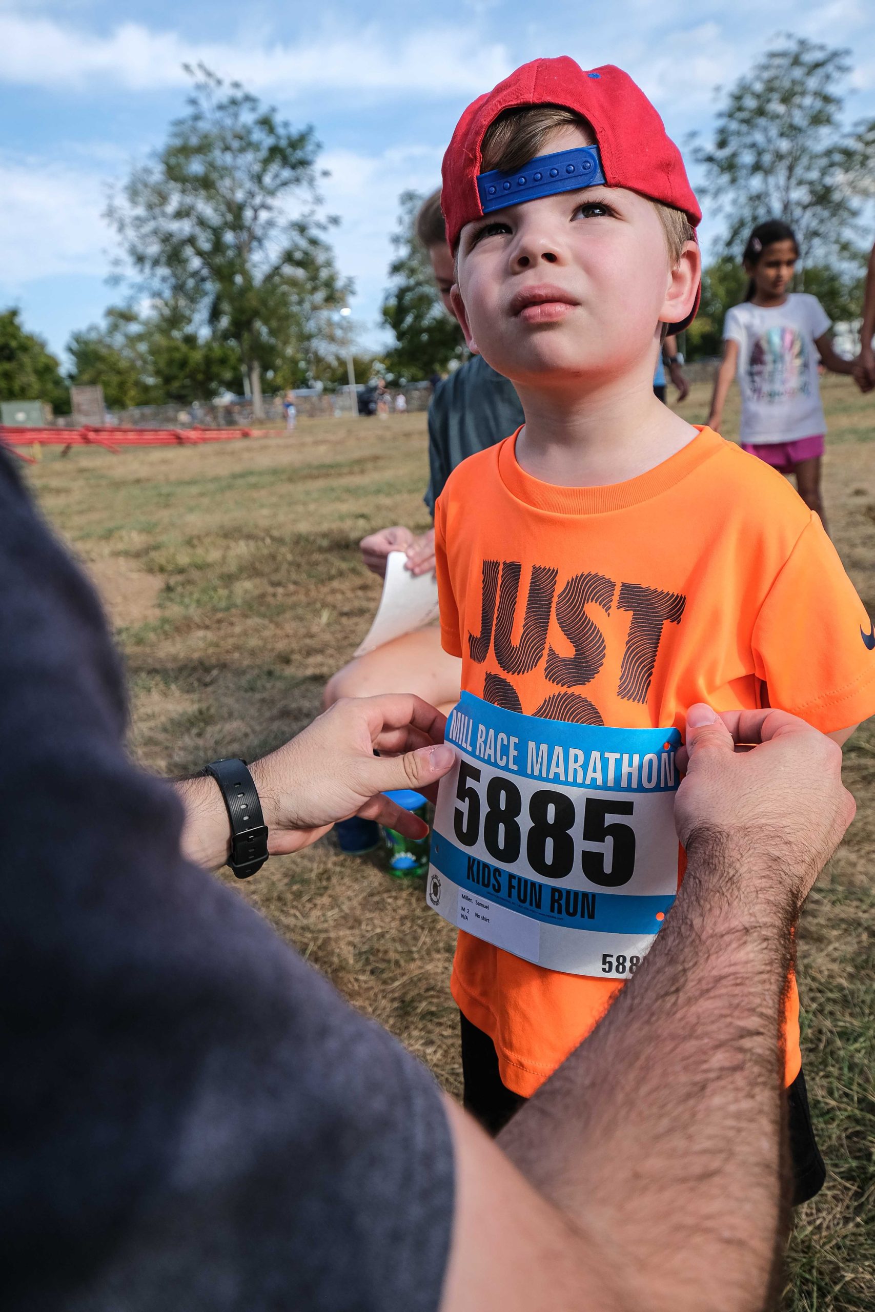 Samuel Miller gets some help from his dad Caleb with his runner’s bib before the Kids Fun Run at Mill Race Park in Columbus, Ind., Friday, Sept. 22, 2023.