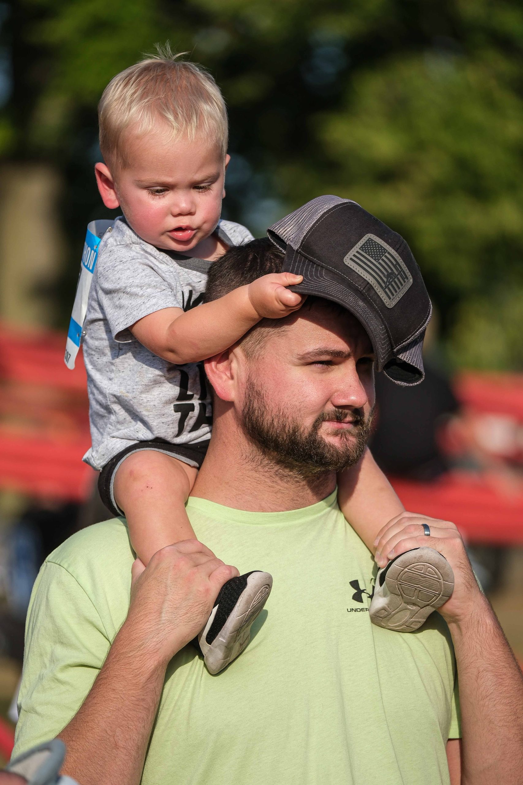 Nick Minnich carries his son Matt on his shoulders before the Kids Fun Run at Mill Race Park in Columbus, Ind., Friday, Sept. 22, 2023.