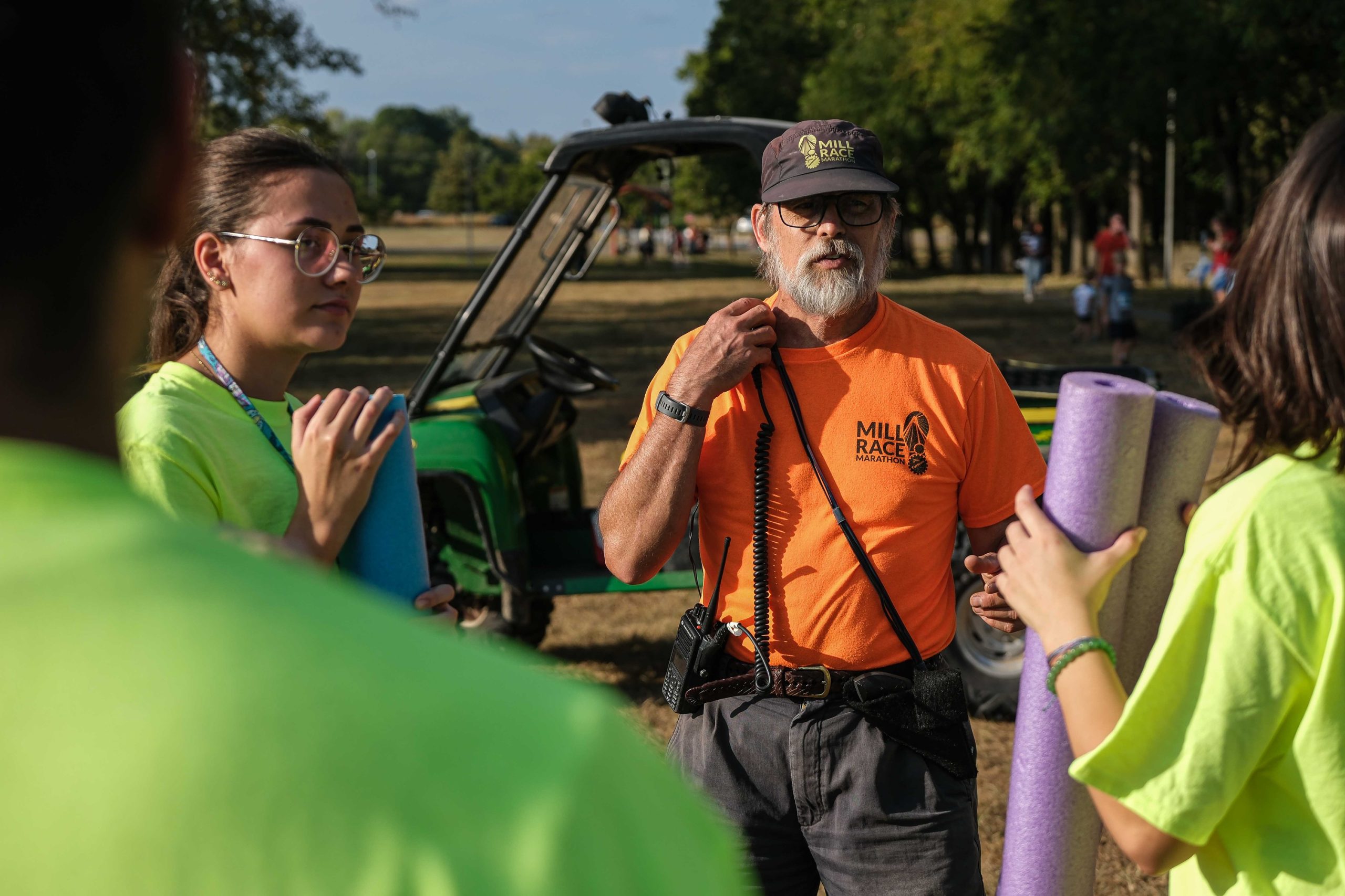 Mill Race Marathon Race Director and Volunteer Coordinator Randy Stafford thanks a group of volunteers before the Kids Fun Run at Mill Race Park in Columbus, Ind., Friday, Sept. 22, 2023.