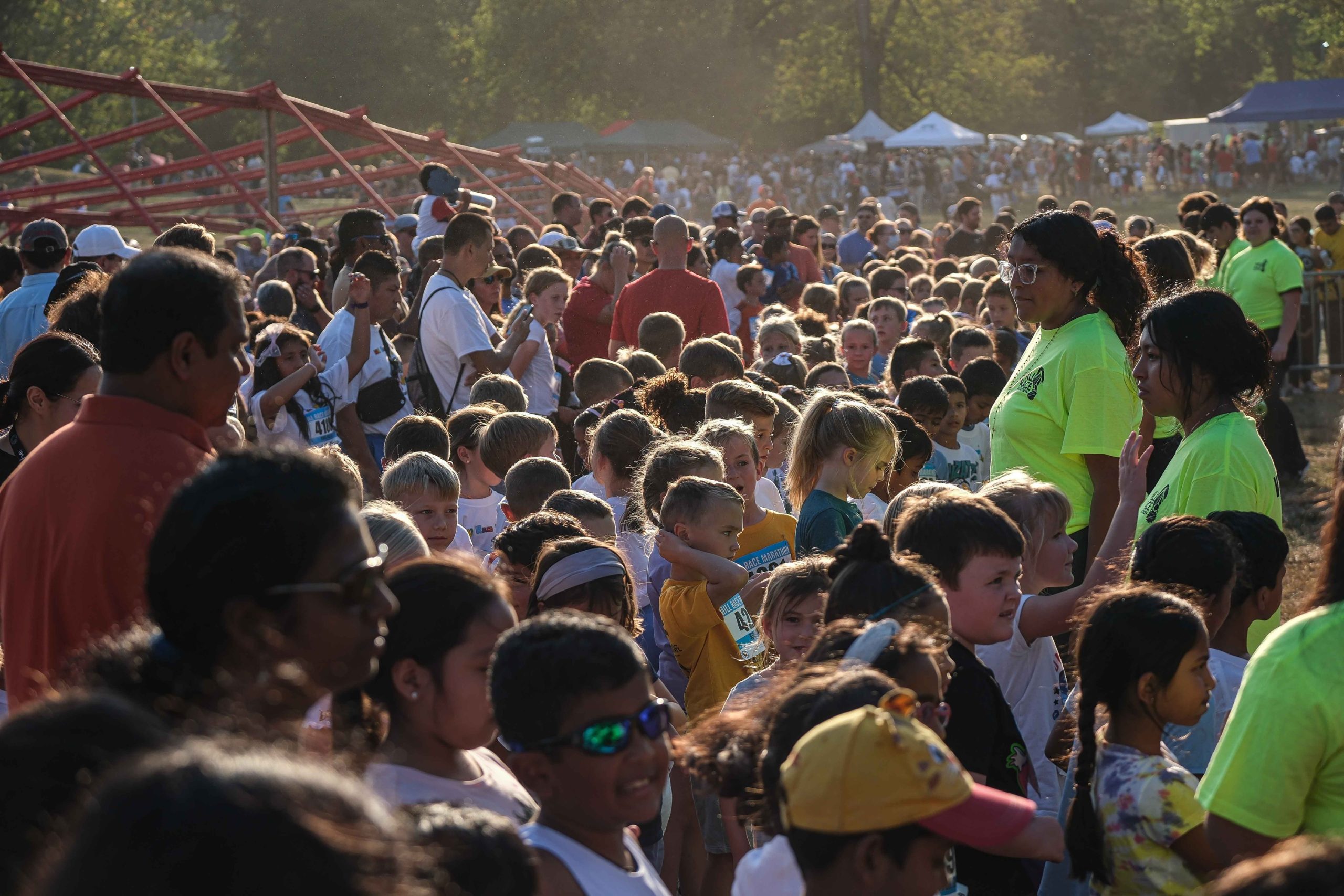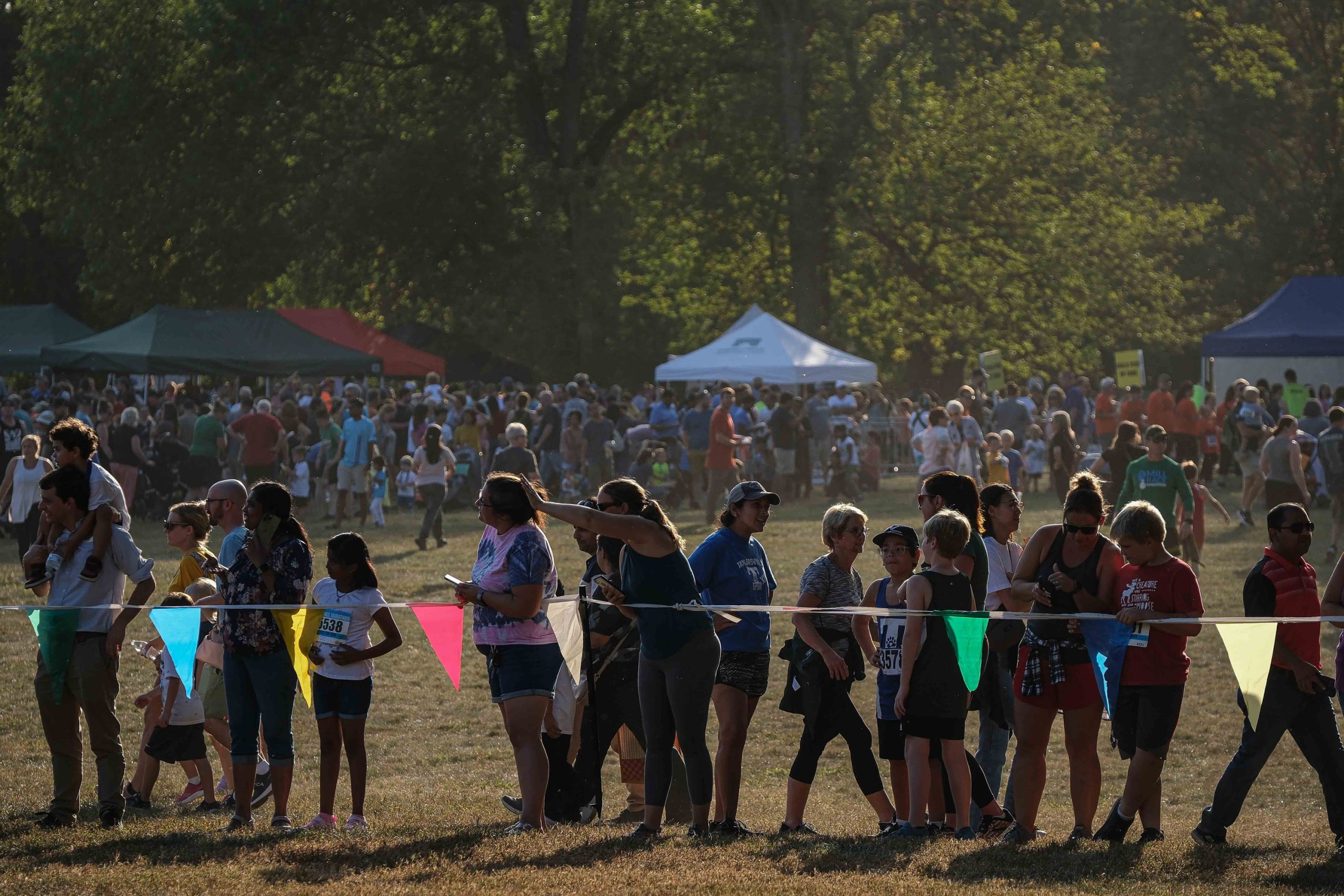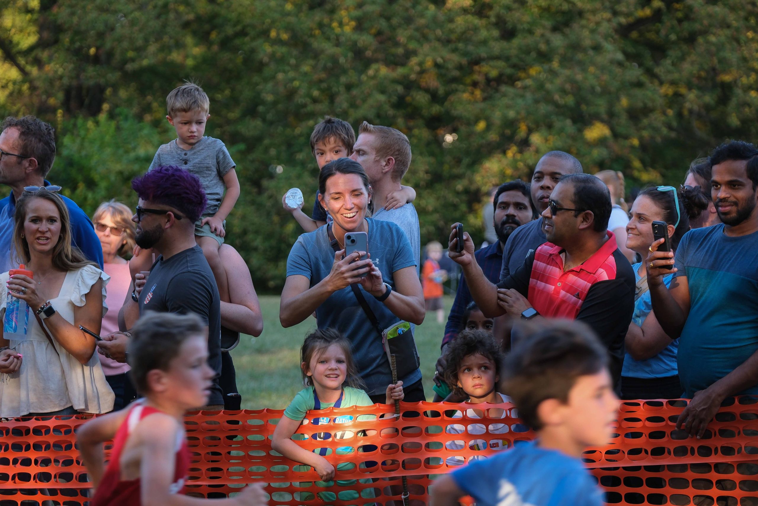 Spectators line up to watch the Kids Fun Run at Mill Race Park in Columbus, Ind., Friday, Sept. 22, 2023.