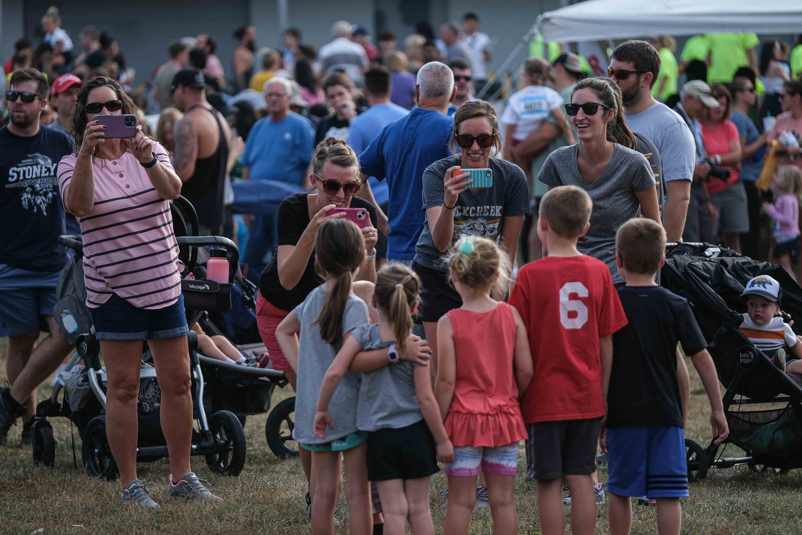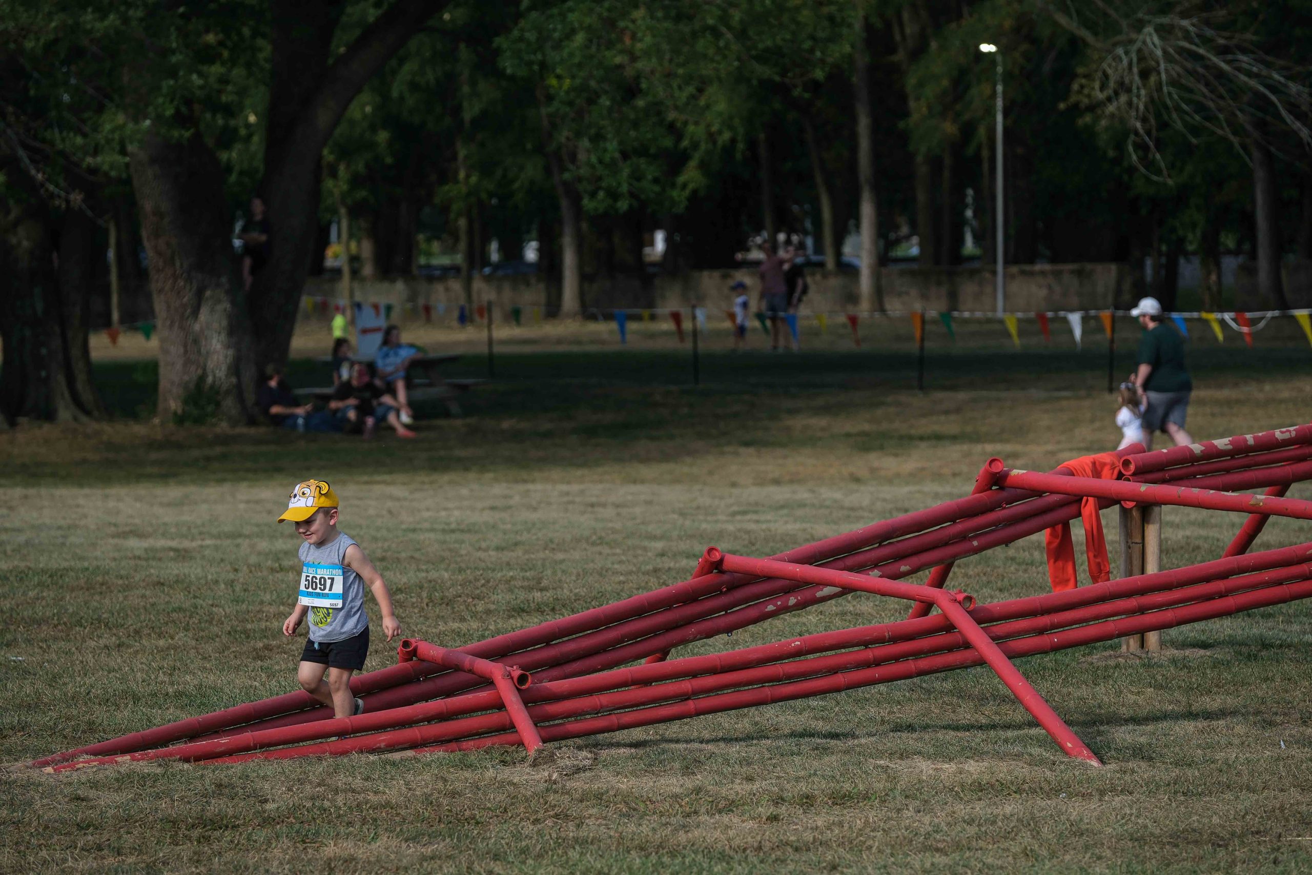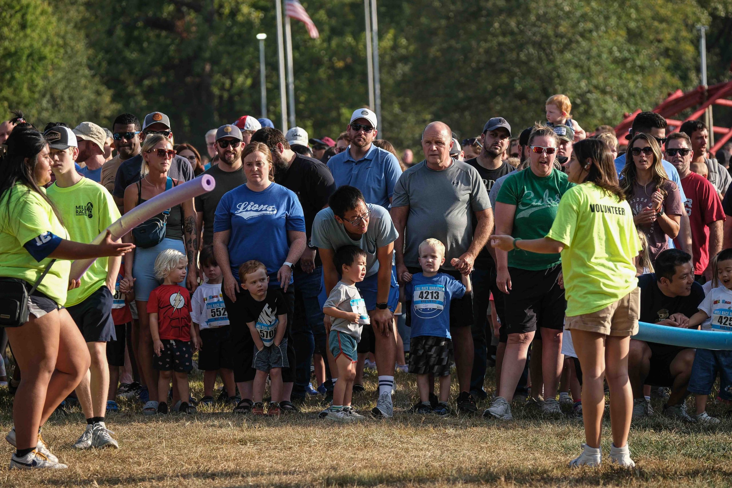 Spectators line up to watch the Kids Fun Run at Mill Race Park in Columbus, Ind., Friday, Sept. 22, 2023.