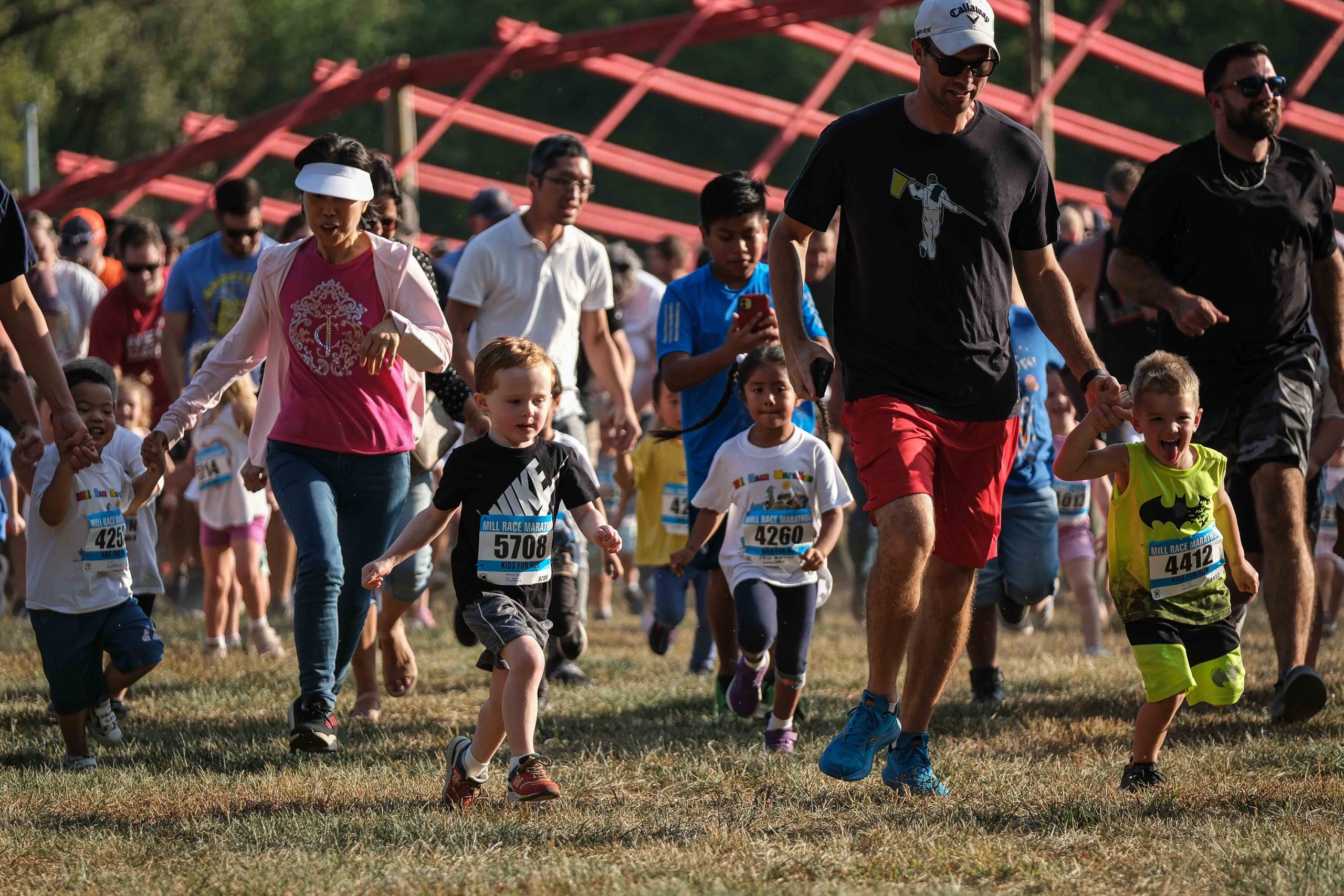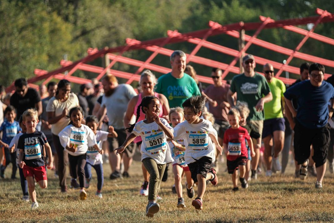 Children sprint out ahead of the adults in the Kids Fun Run at Mill Race Park in Columbus, Ind., Friday, Sept. 22, 2023.