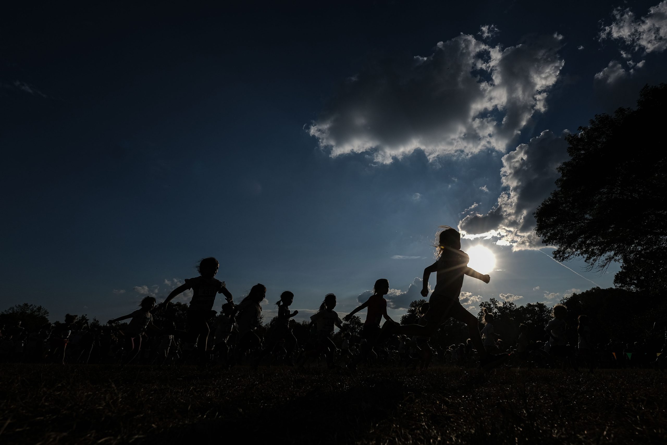 A group of children are silhouetted as they take part in the Kids Fun Run at Mill Race Park in Columbus, Ind., Friday, Sept. 22, 2023.