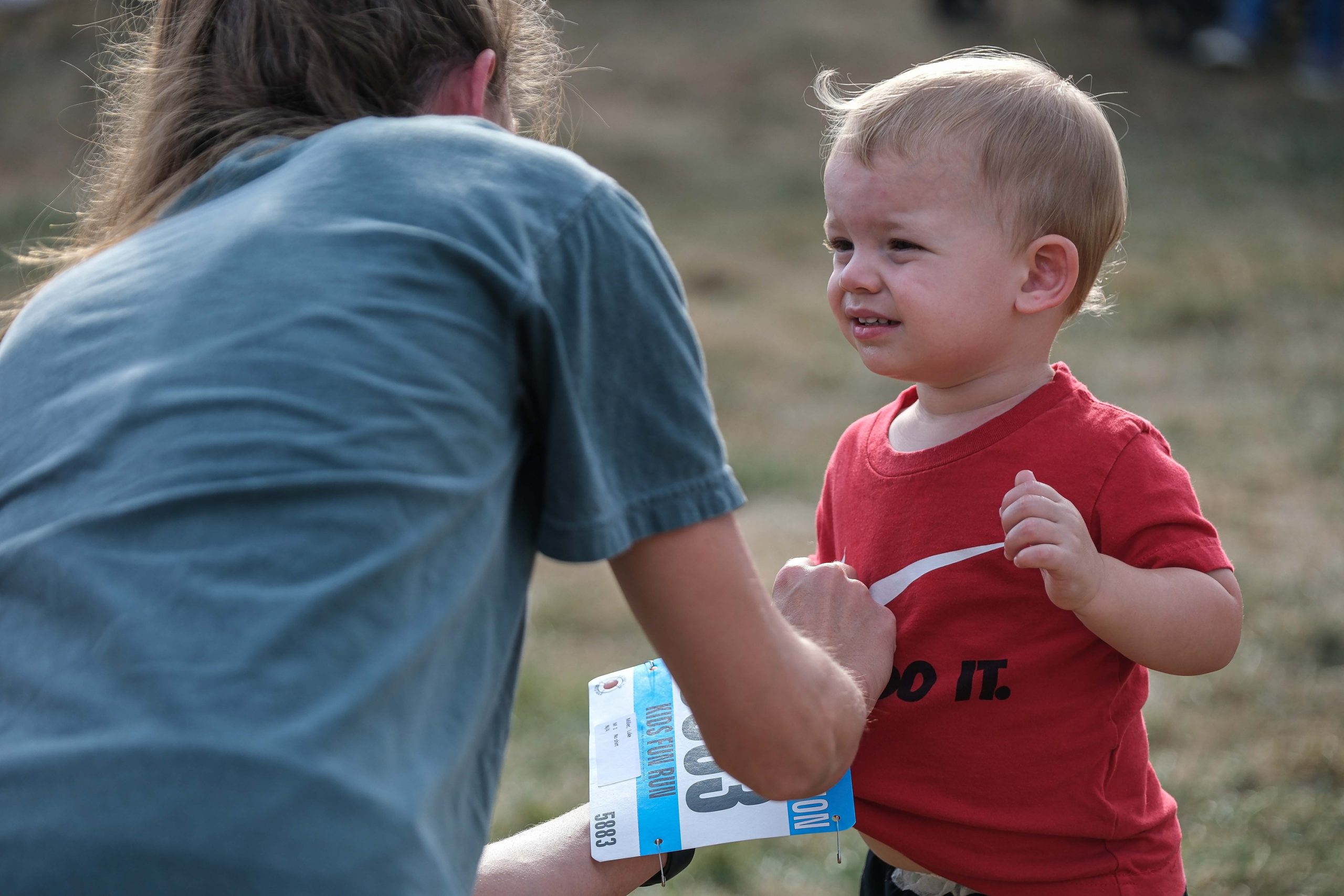 Kerri Miller helps her son Luke with his runner’s bib before the Kids Fun Run at Mill Race Park in Columbus, Ind., Friday, Sept. 22, 2023.