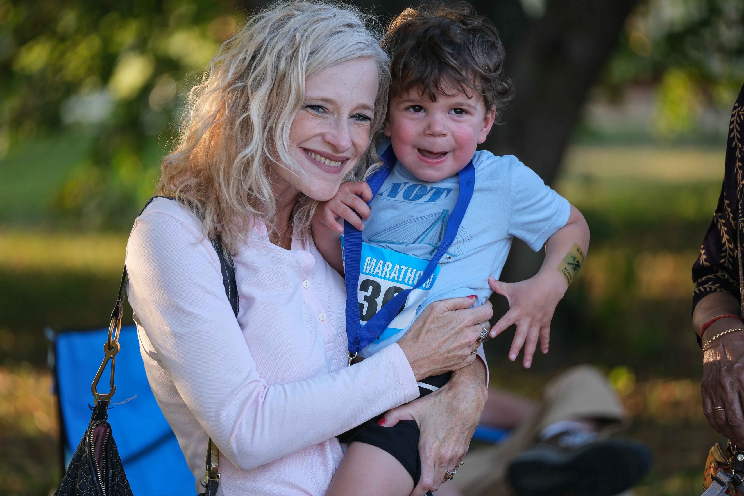 Diane Doup holds her nephew Asher Pandit after he completed the Kids Fun Run at Mill Race Park in Columbus, Ind., Friday, Sept. 22, 2023.