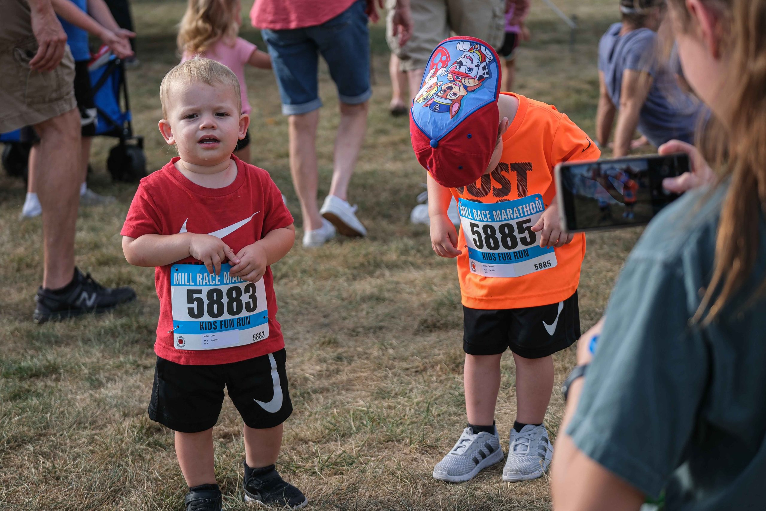 Luke and Samuel Miller pose for photos before the Kids Fun Run at Mill Race Park in Columbus, Ind., Friday, Sept. 22, 2023.
