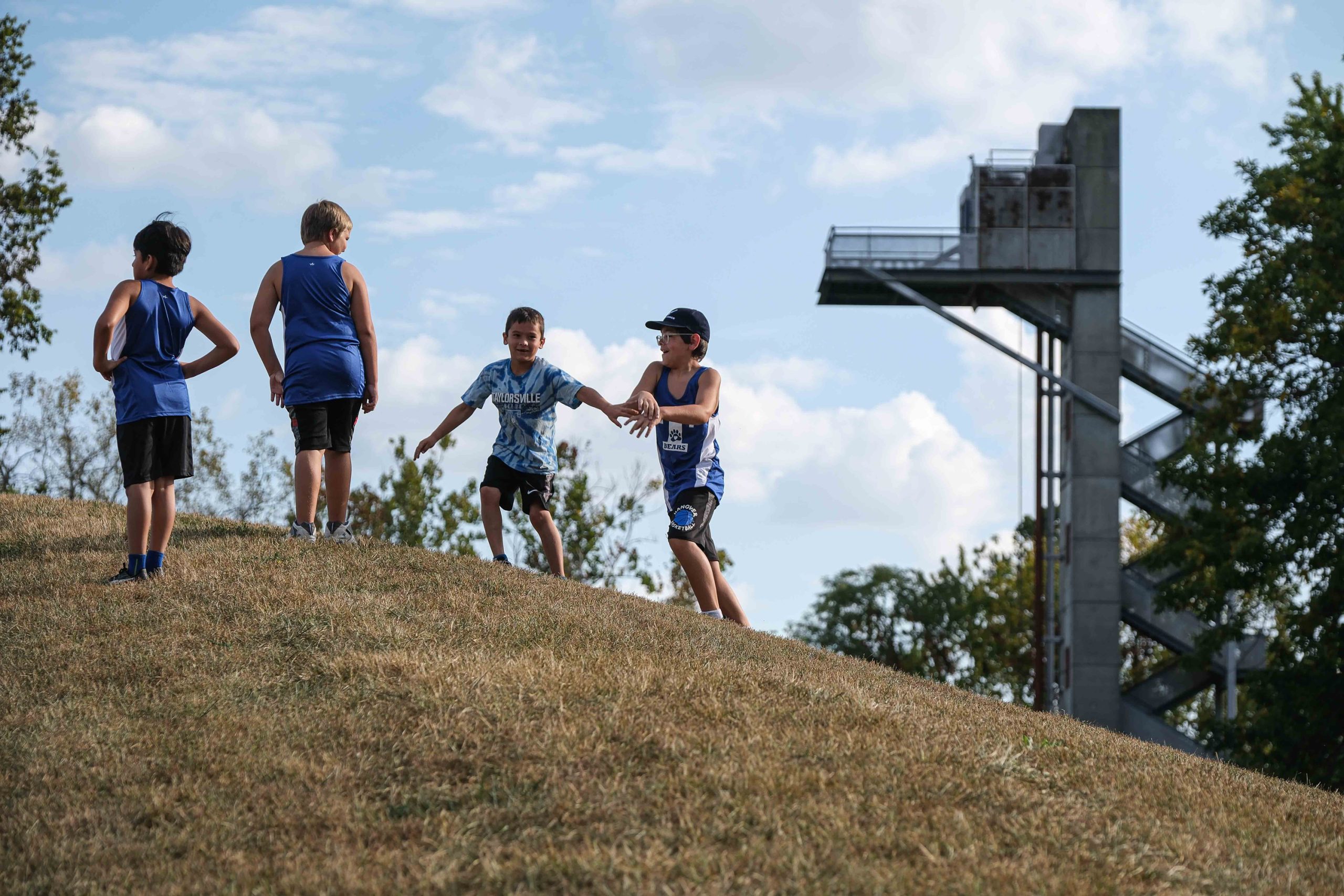 Members of the Taylorsville Elementary cross country team goof around before taking part in the Kids Fun Run at Mill Race Park in Columbus, Ind., Friday, Sept. 22, 2023.