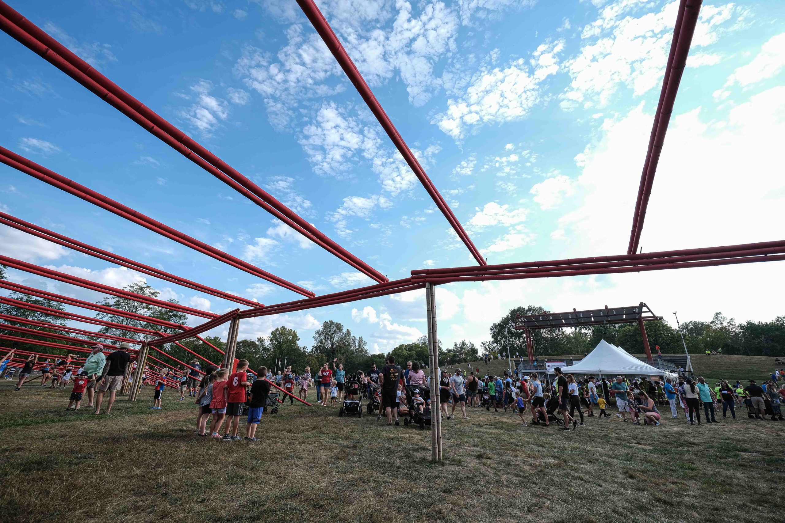 Brantley Hutson plays on Exhibit Columbus installation Echoes of the Hill before the Kids Fun Run at Mill Race Park in Columbus, Ind., Friday, Sept. 22, 2023.