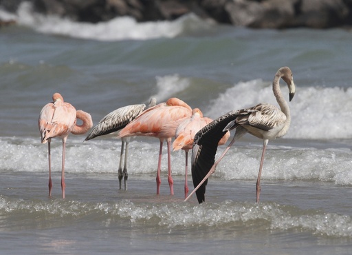 The birds stood quietly 25 feet (7.6 meters) off Lake Michigan’s western shoreline as waves lapped against their thin legs. Three were adults, identifiable by their pink plumage, and two were juveniles clad in gray.