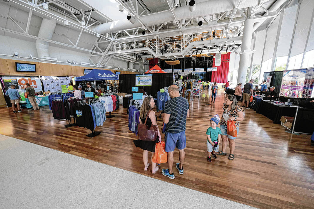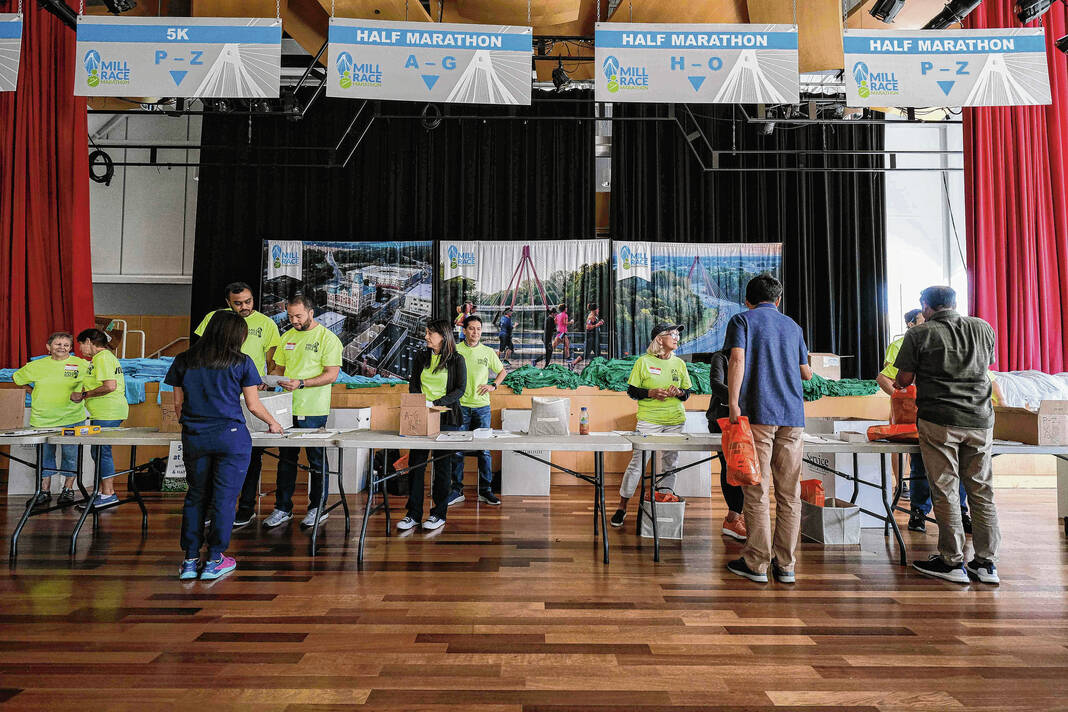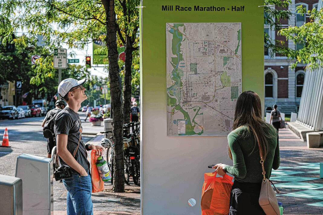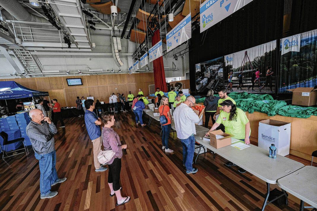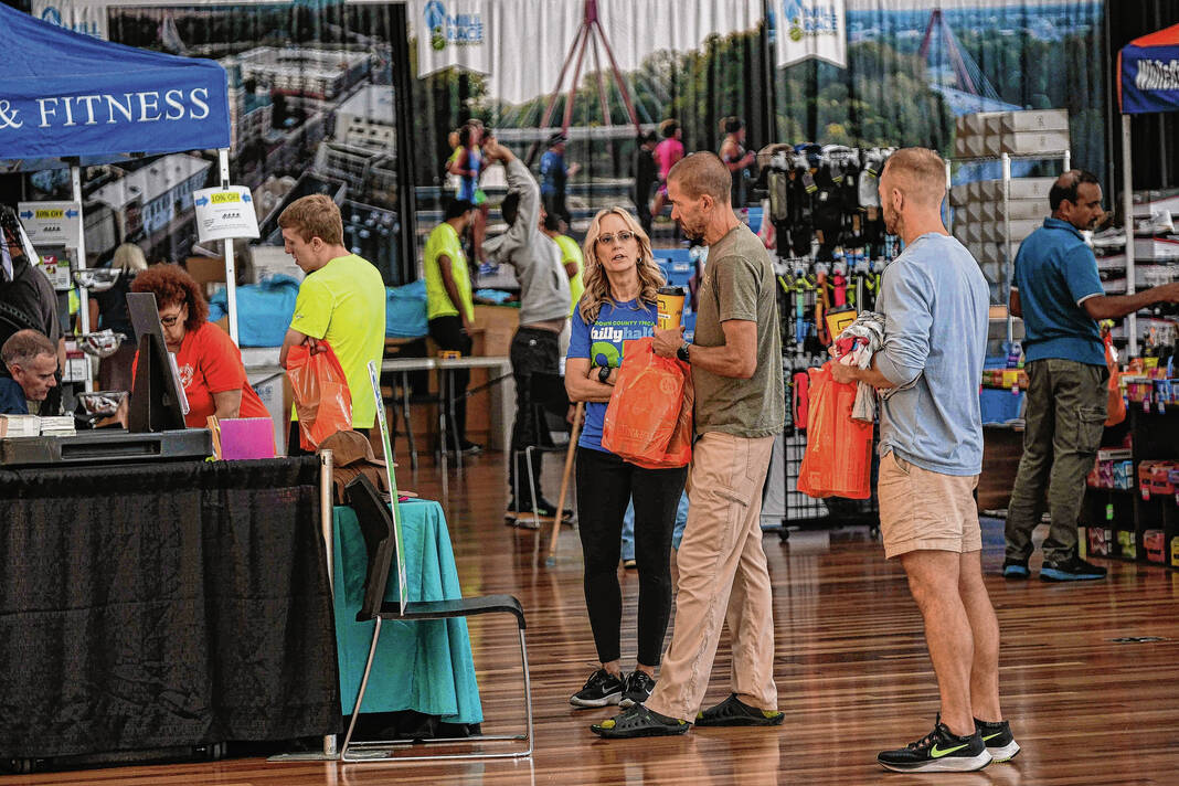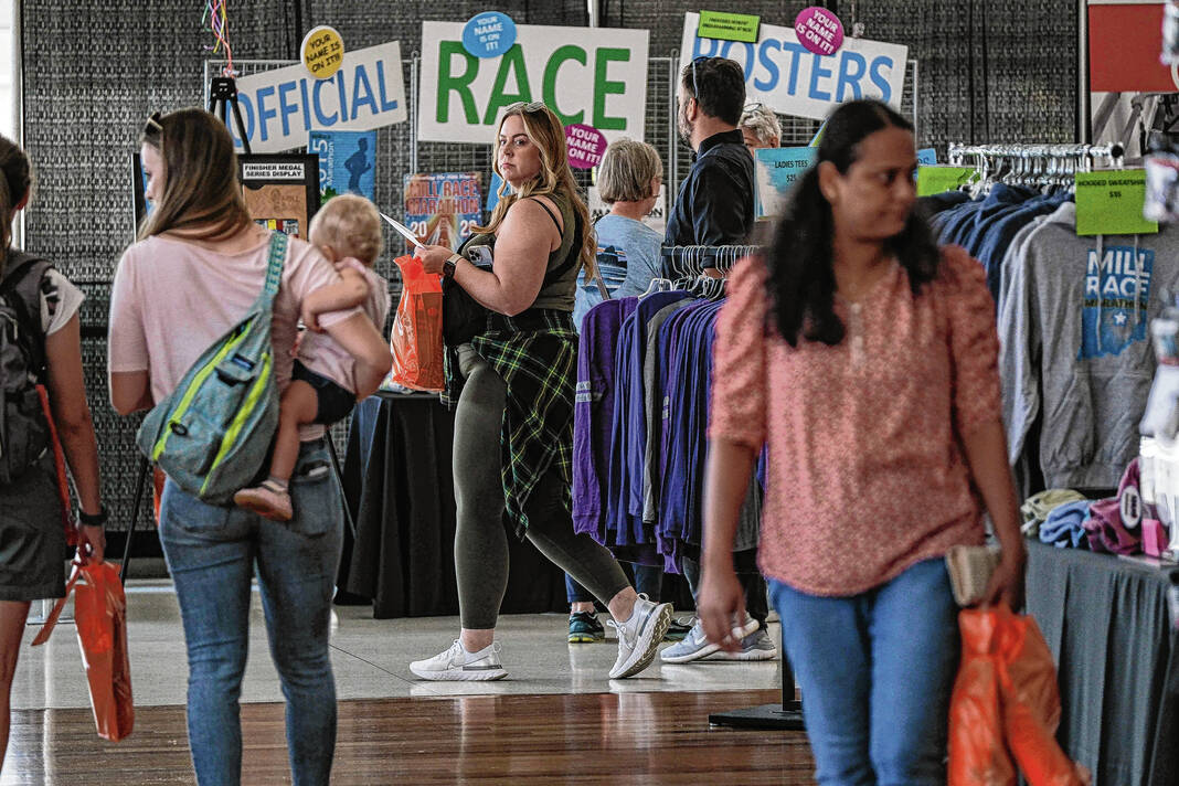 Mike Wolanin | The Republic People check out the various booths during the Mill Race Marathon expo at The Commons in Columbus, Ind., Friday, Sept. 22, 2023.