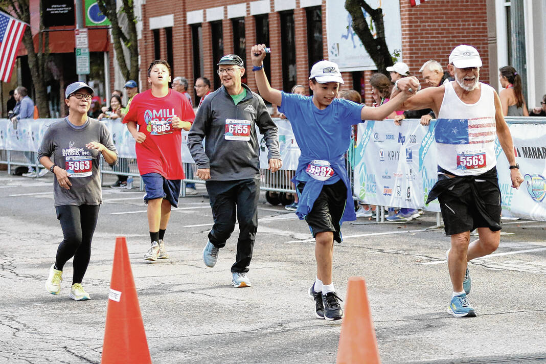 Carla Clark | For The Republic Evan Scherschel and his grandfather Greg Scherschel celebrate crossing the finish line during the Mill Race Marathon in Columbus, Ind., September 24, 2022.