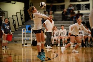 Hauser’s Mattie Foster (3) digs out a serve as Hauser’s Charleston Gelfius (5) looks on during a match against Shelbyville at Hauser High School.