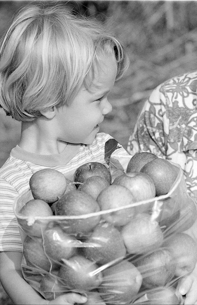 Mark Mitchell carried a big bag of apples picked by his classmates at Penny Lane Pre-School during a field trip to High Acres Orchard at Columbus Youth Camp in 1973.
