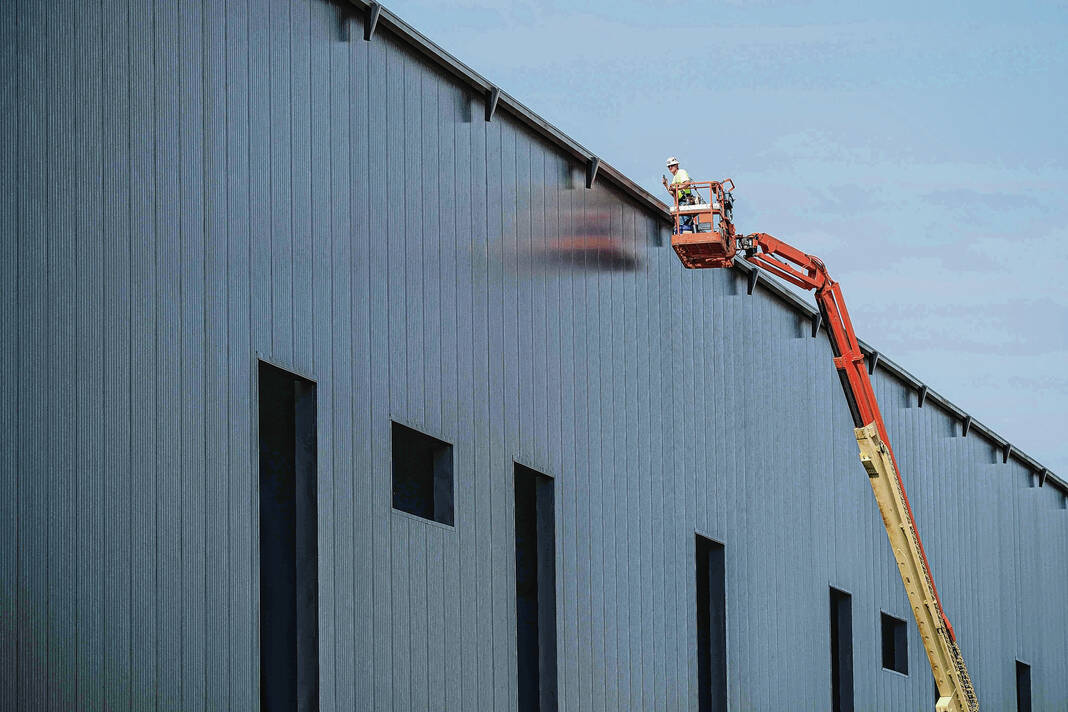 Mike Wolanin | The Republic Contractors put paneling on the outside of the Circle K Fieldhouse at NexusPark in Columbus, Ind., Wednesday, July 26, 2023.