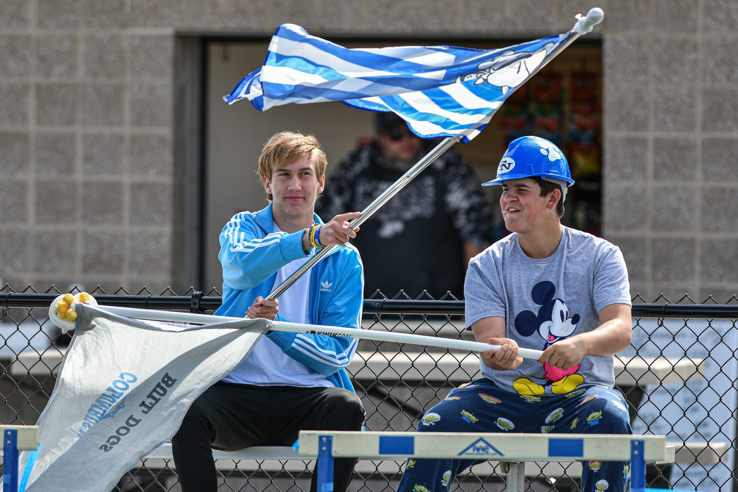 Columbus North students Benjamin Stevens, left, and Gabriel Marsh wave flags before the start of a sectional final soccer match between Columbus North and Roncalli at the BCSC Soccer Complex in Columbus, Ind., Saturday, Oct. 7, 2023. North defeated Roncalli 4-2 to win the sectional title.