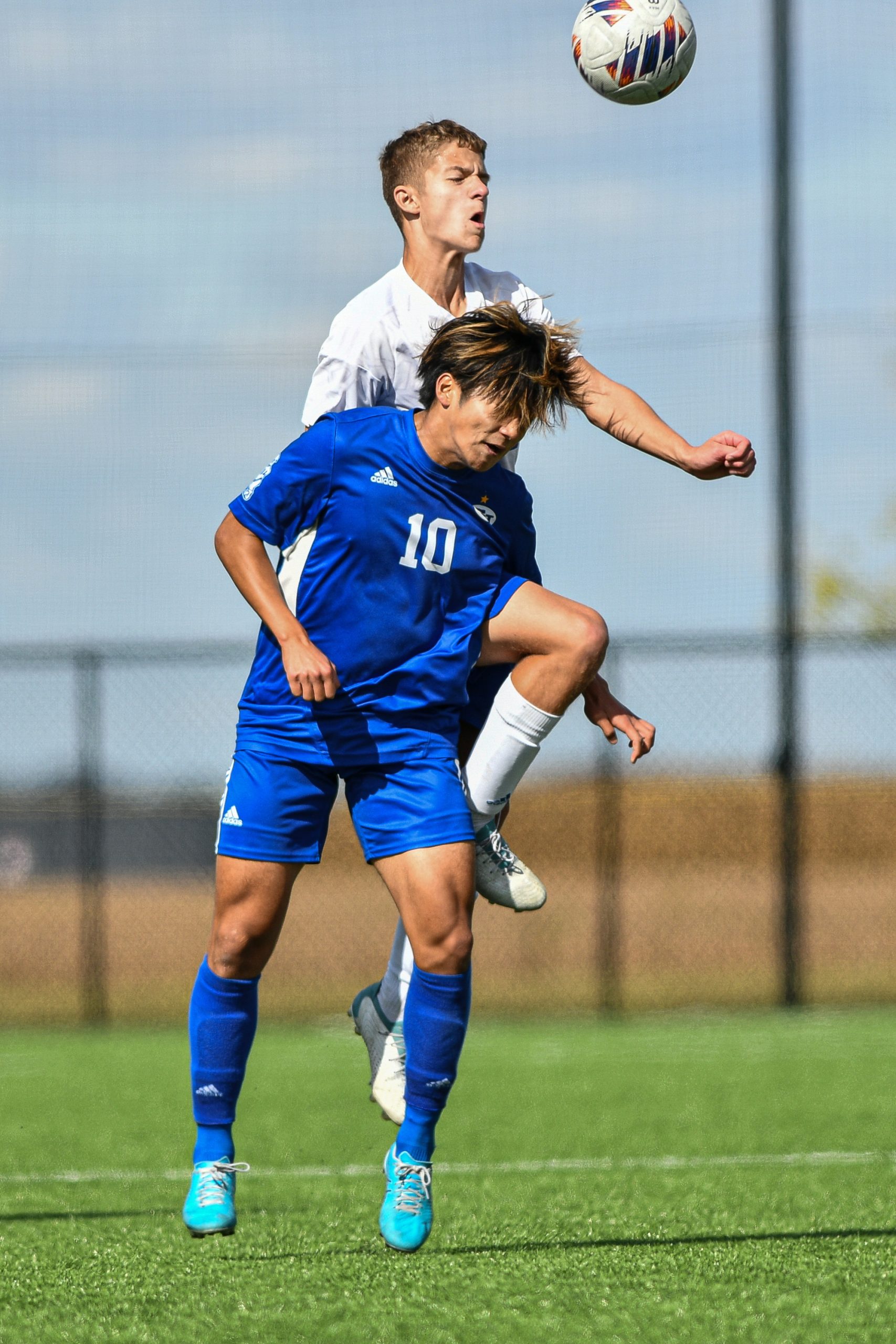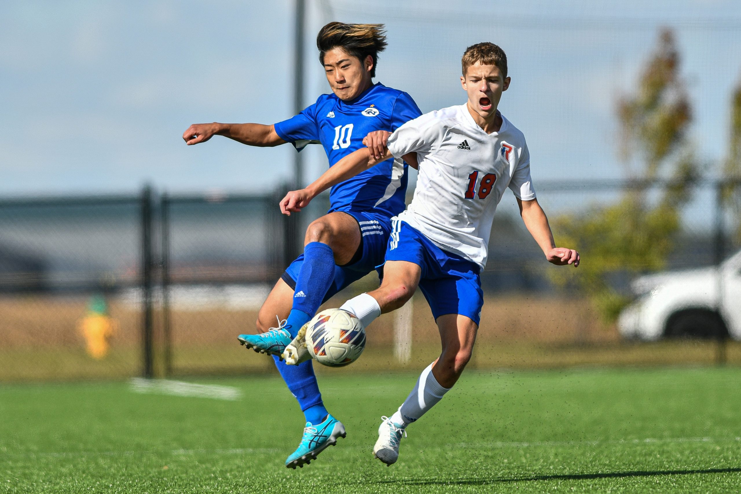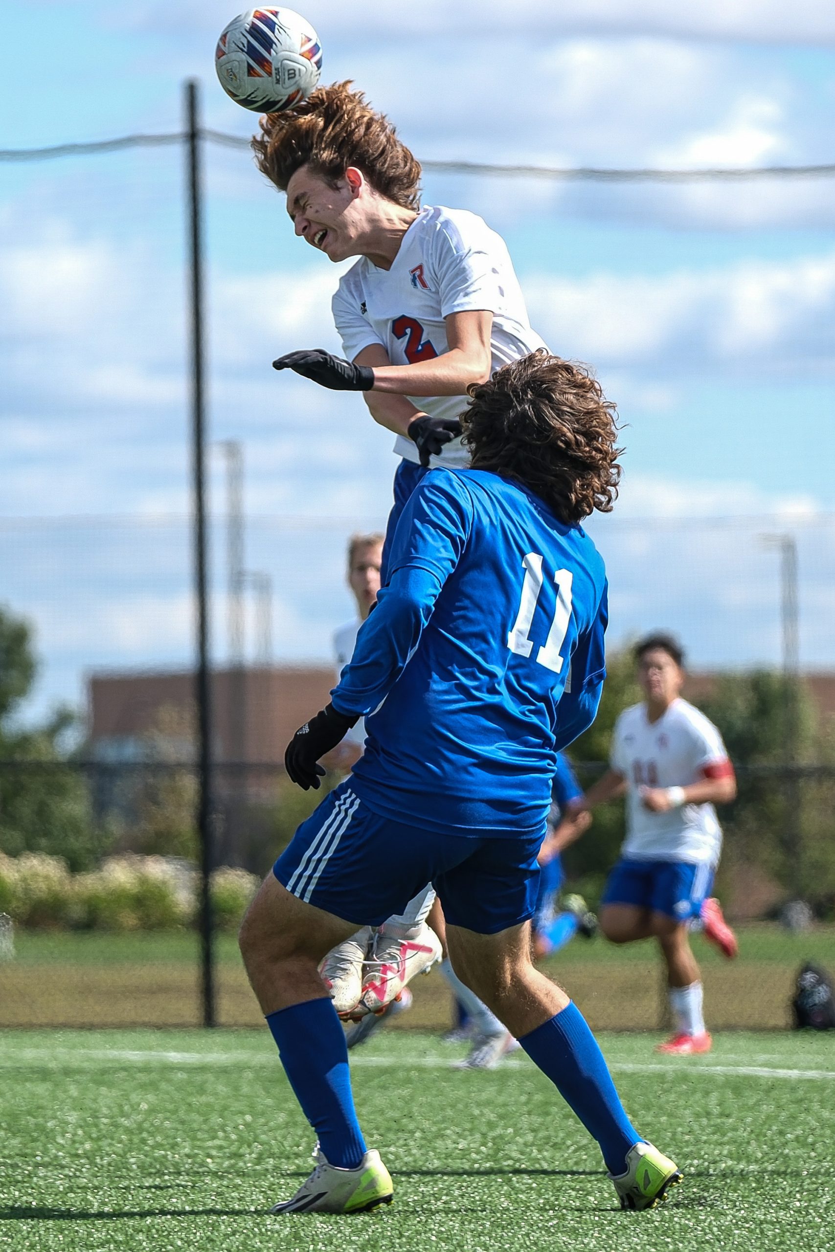 Columbus North’s Misaki Takemoto, in blue, and Roncalli’s Tanner Miller collide while going for a header during a sectional final soccer match between Columbus North and Roncalli at the BCSC Soccer Complex in Columbus, Ind., Saturday, Oct. 7, 2023. North defeated Roncalli 4-2 to win the sectional title.