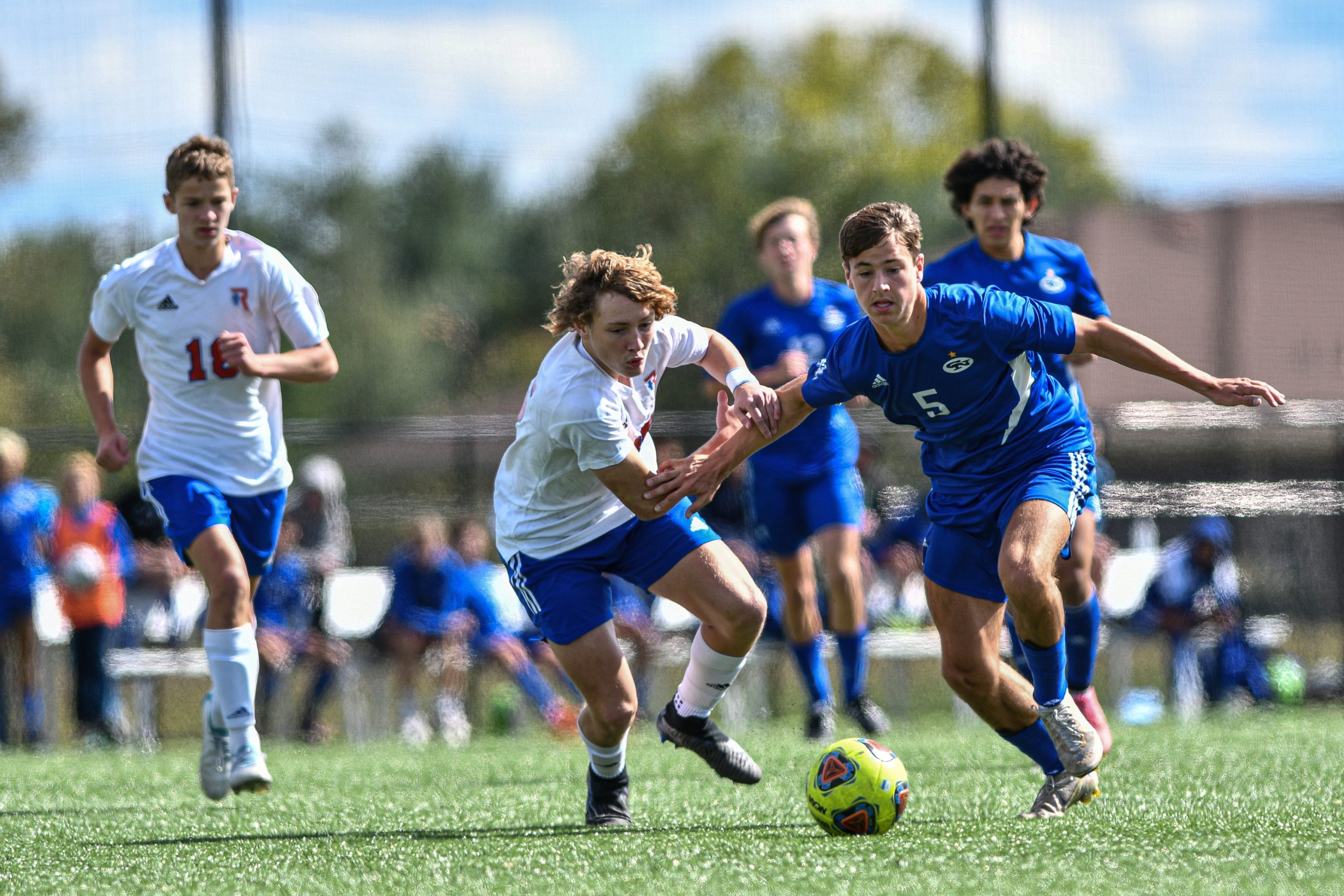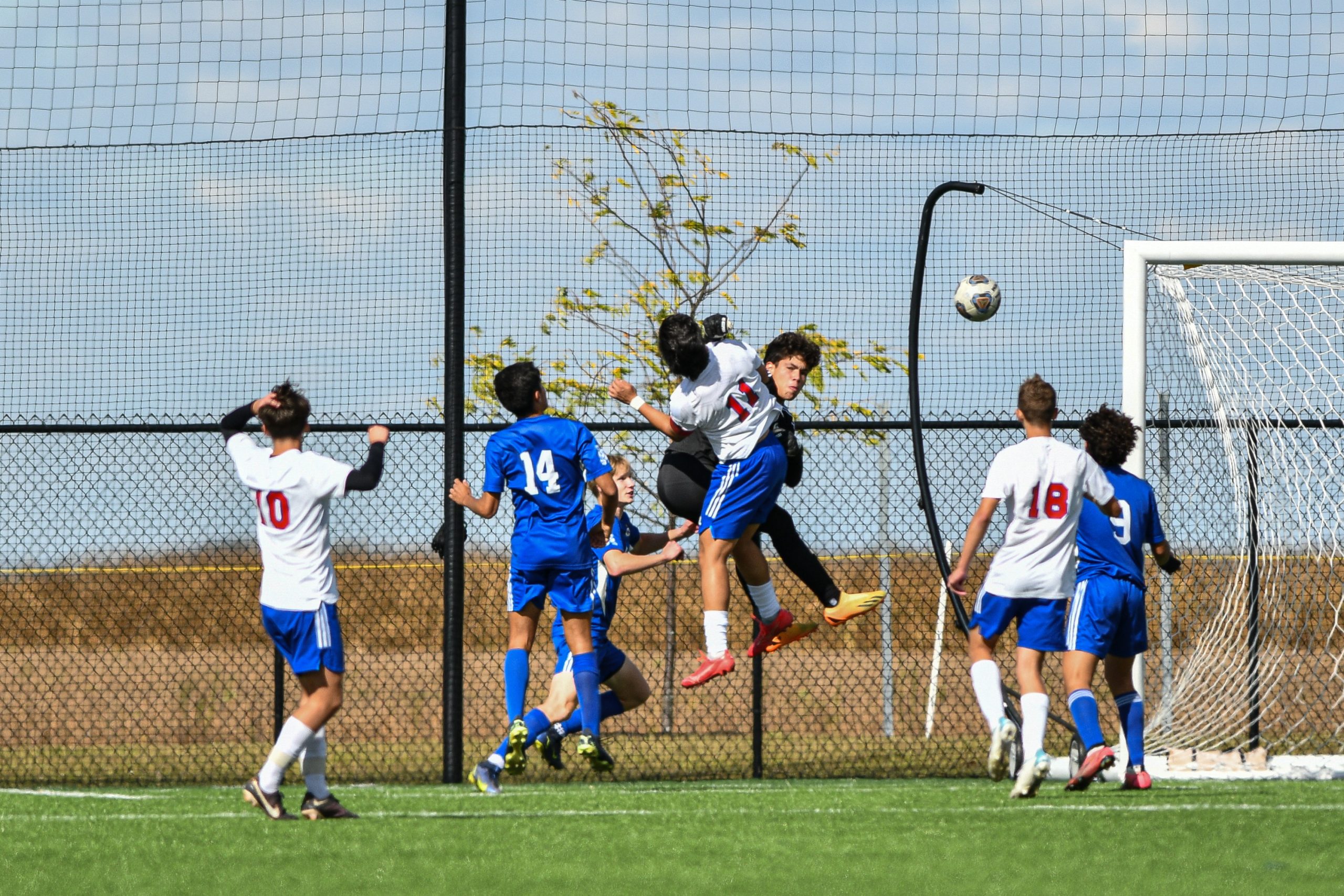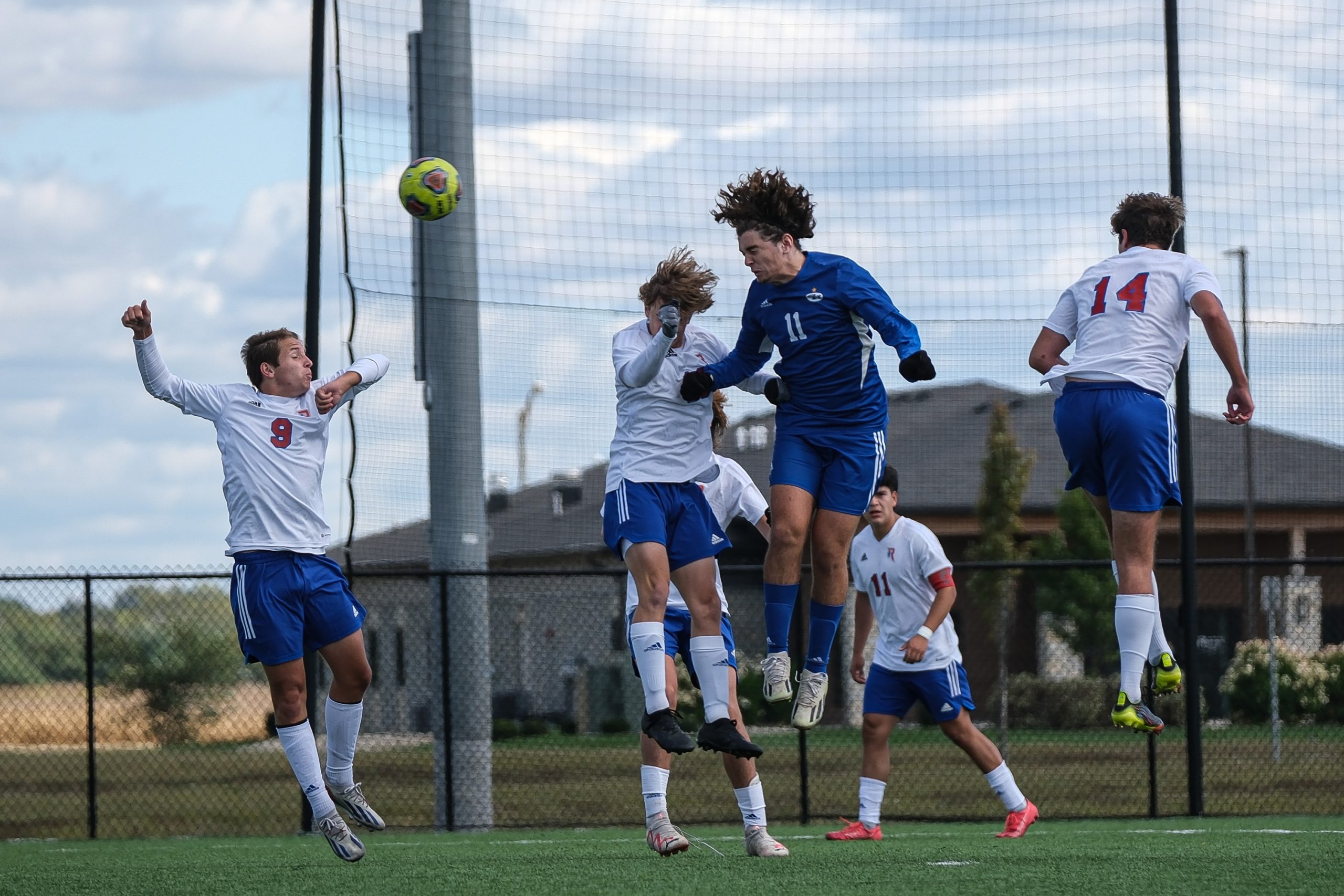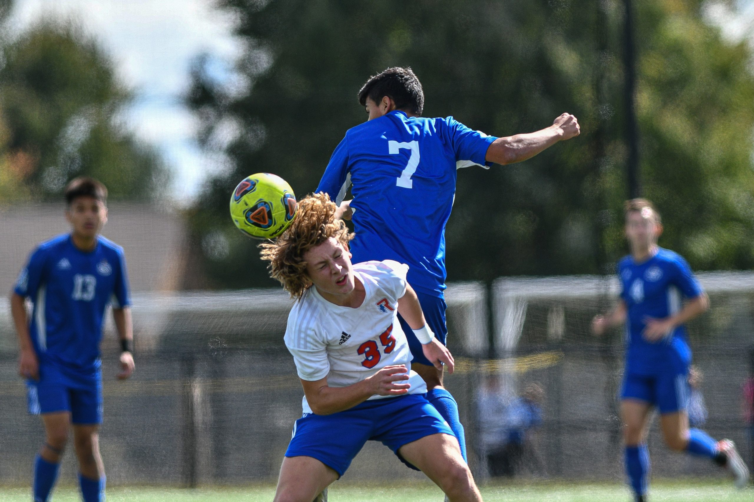 Columbus North’s Misaki Takemoto, in blue, and Roncalli’s Tanner Miller collide while going for a header during a sectional final soccer match between Columbus North and Roncalli at the BCSC Soccer Complex in Columbus, Ind., Saturday, Oct. 7, 2023. North defeated Roncalli 4-2 to win the sectional title.