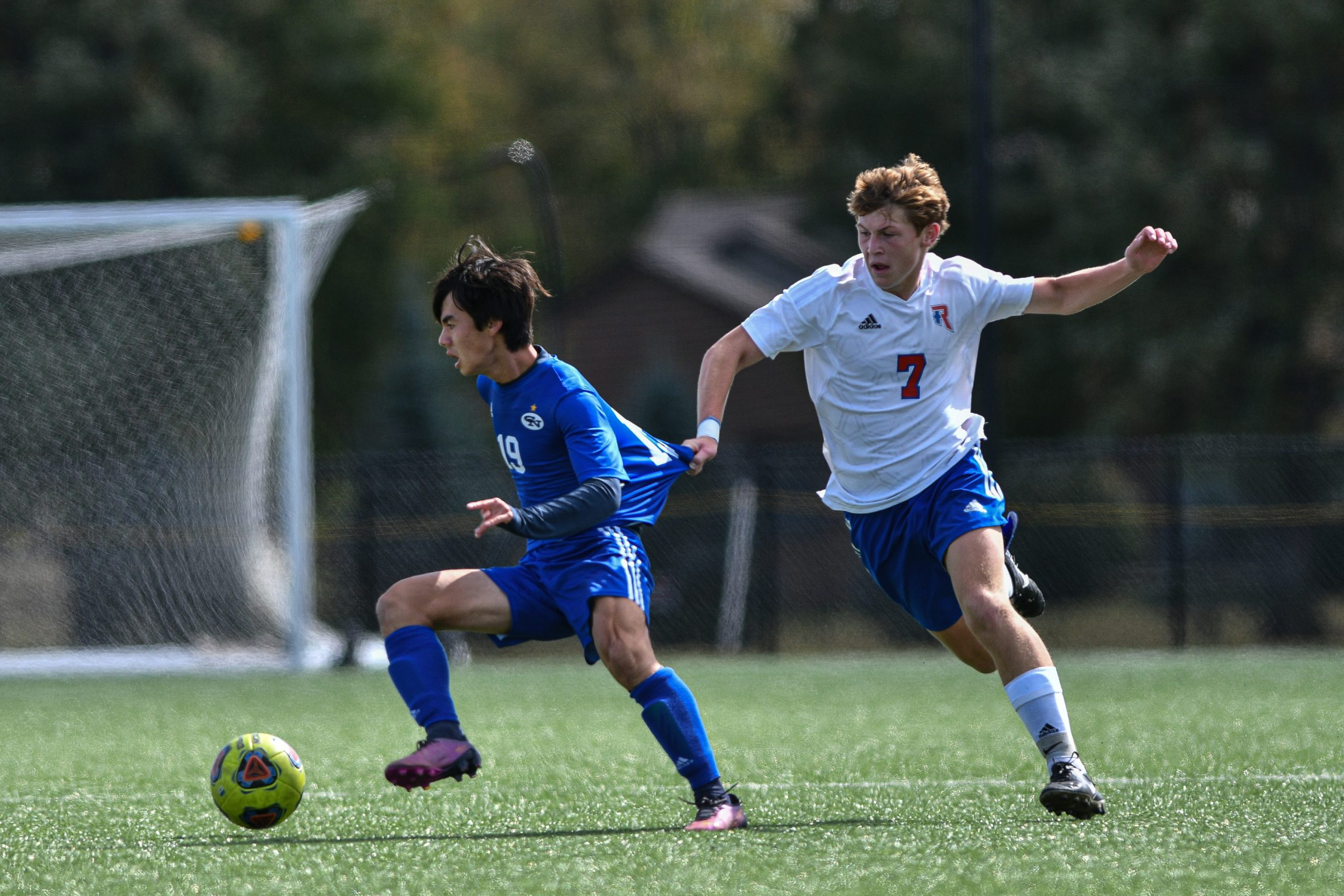 Roncalli’s Sam Purdy, right, grabs the jersey of Columbus North’s Nico Gotoh after getting beat on the dribble during a sectional final soccer match between Columbus North and Roncalli at the BCSC Soccer Complex in Columbus, Ind., Saturday, Oct. 7, 2023. North defeated Roncalli 4-2 to win the sectional title.