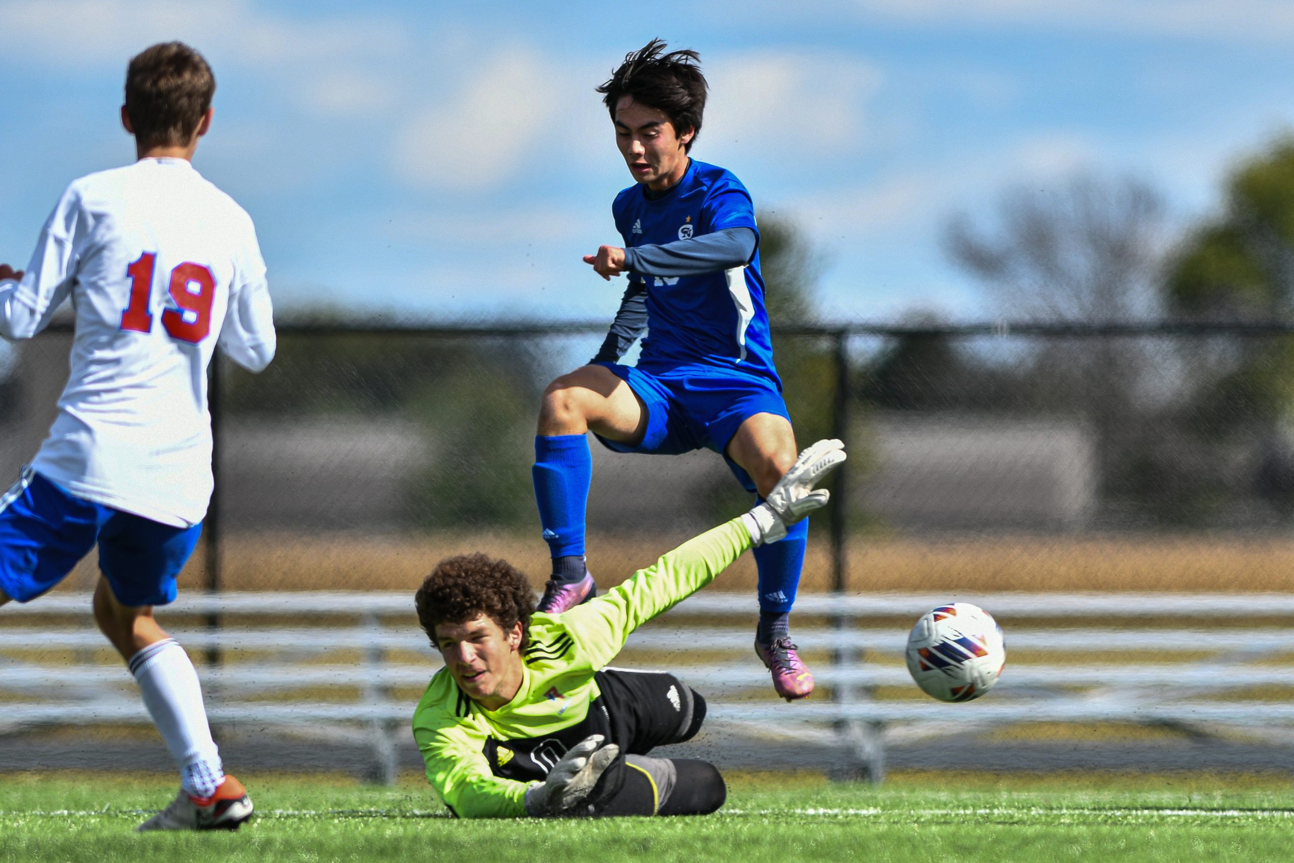 Roncalli goalkeeper Kiefer Lawry stops a shot by Columbus North’s Nico Gotoh during a sectional final soccer match between Columbus North and Roncalli at the BCSC Soccer Complex in Columbus, Ind., Saturday, Oct. 7, 2023. North defeated Roncalli 4-2 to win the sectional title.