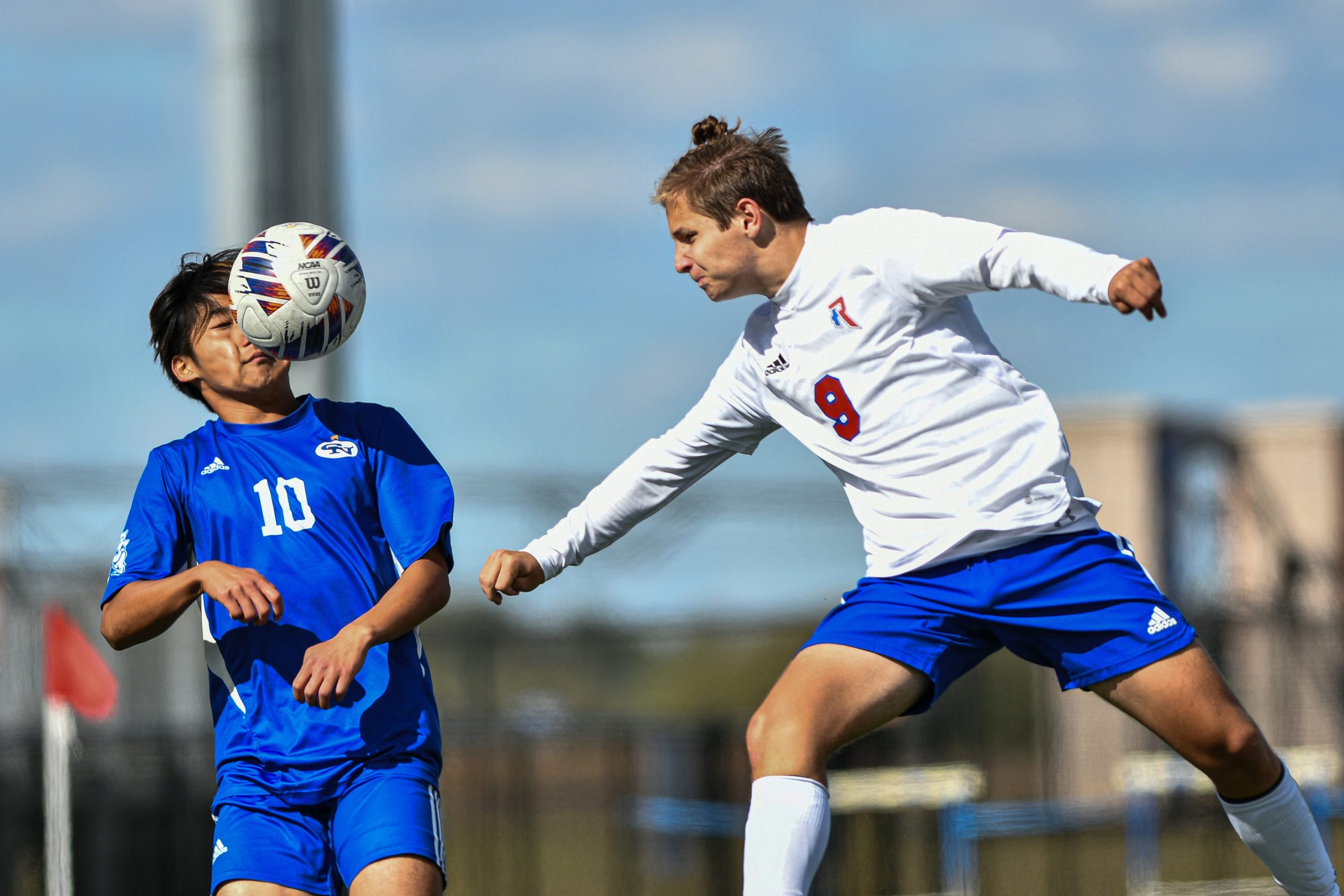 A header by Roncalli’s Andrew Curry, right, hits Columbus North’s Misaki Takemoto in the face during a sectional final soccer match between Columbus North and Roncalli at the BCSC Soccer Complex in Columbus, Ind., Saturday, Oct. 7, 2023. North defeated Roncalli 4-2 to win the sectional title.