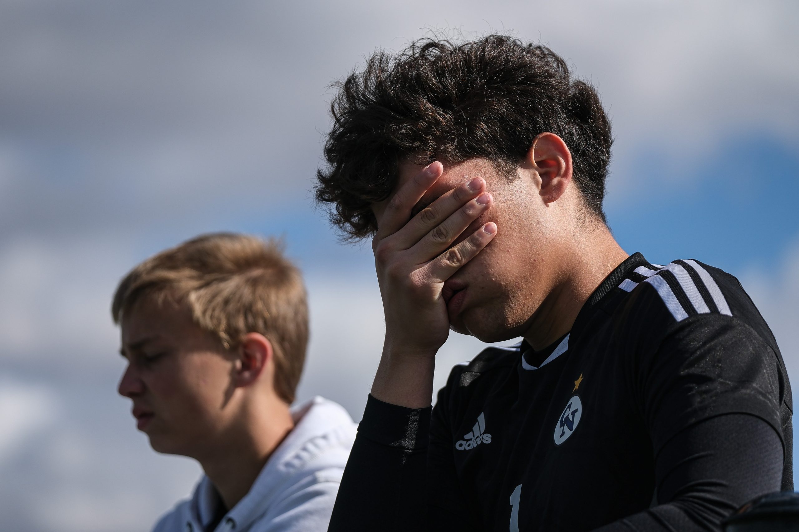 Columbus North goalkeeper Juan Jose Salcedo Calderon puts his head in his hand while watching his team play the final minutes of a sectional final soccer match against Roncalli at the BCSC Soccer Complex in Columbus, Ind., Saturday, Oct. 7, 2023. Calderon received a red card for a dangerous play at goalkeeper and had to sit out the rest of the match. North defeated Roncalli 4-2 to win the sectional title.
