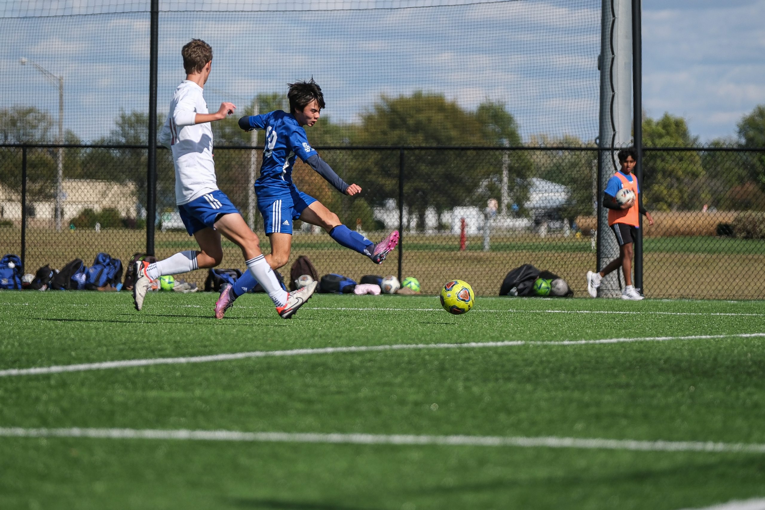 Columbus North’s Nico Gotoh, right, takes a shot while marked by Roncalli’s Noah Petralia during a sectional final soccer match between Columbus North and Roncalli at the BCSC Soccer Complex in Columbus, Ind., Saturday, Oct. 7, 2023. Gotoh scored North’s go ahead goal late in the second half. North defeated Roncalli 4-2 to win the sectional title.