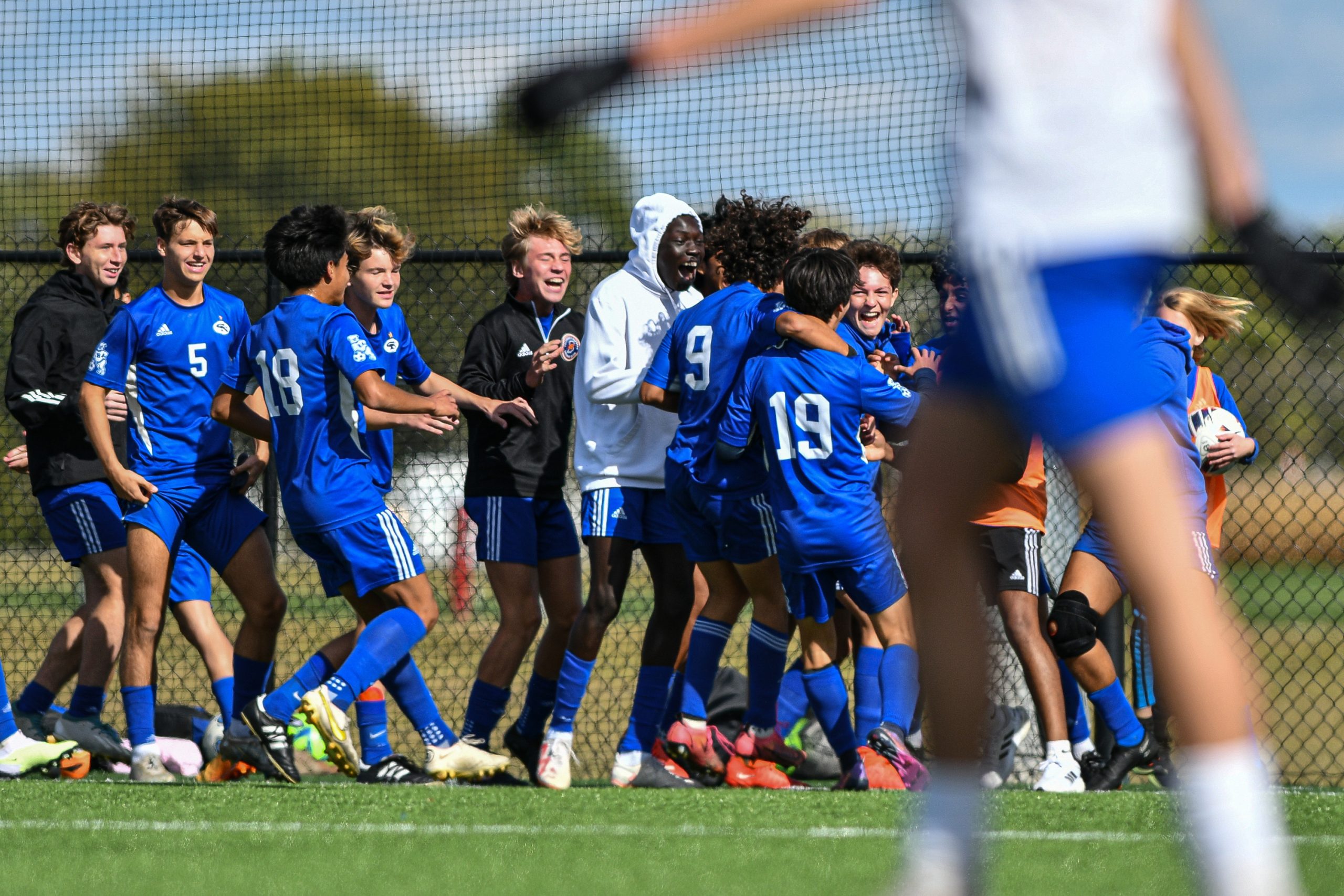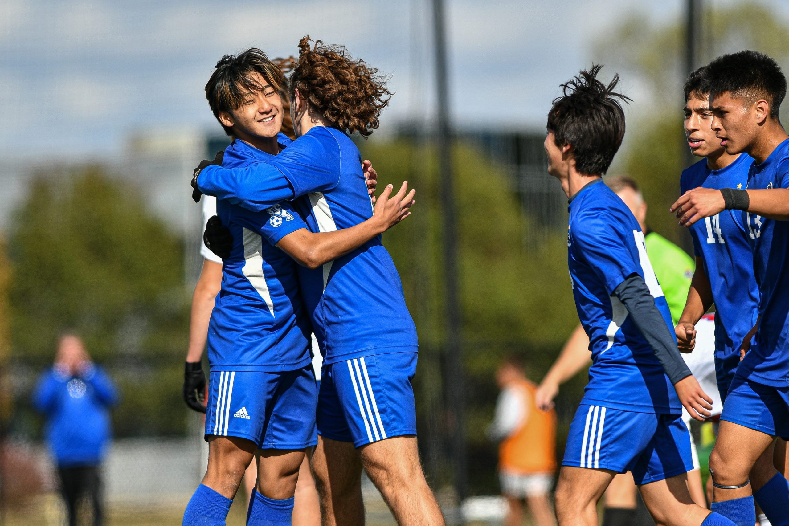 Members of the Columbus North soccer team celebrate with teammate Nico Gotoh (19) after he scored the go ahead goal late in the second half of a sectional final soccer match between Columbus North and Roncalli at the BCSC Soccer Complex in Columbus, Ind., Saturday, Oct. 7, 2023. North defeated Roncalli 4-2 to win the sectional title.