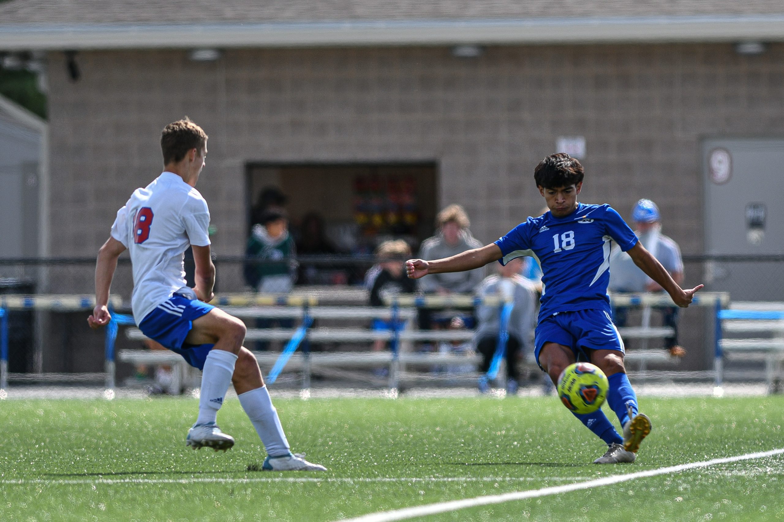 Columbus North’s Madux Tovey, right, takes a shot on goal while marked by Roncalli’s Cole Huff during a sectional final soccer match between Columbus North and Roncalli at the BCSC Soccer Complex in Columbus, Ind., Saturday, Oct. 7, 2023. North defeated Roncalli 4-2 to win the sectional title.