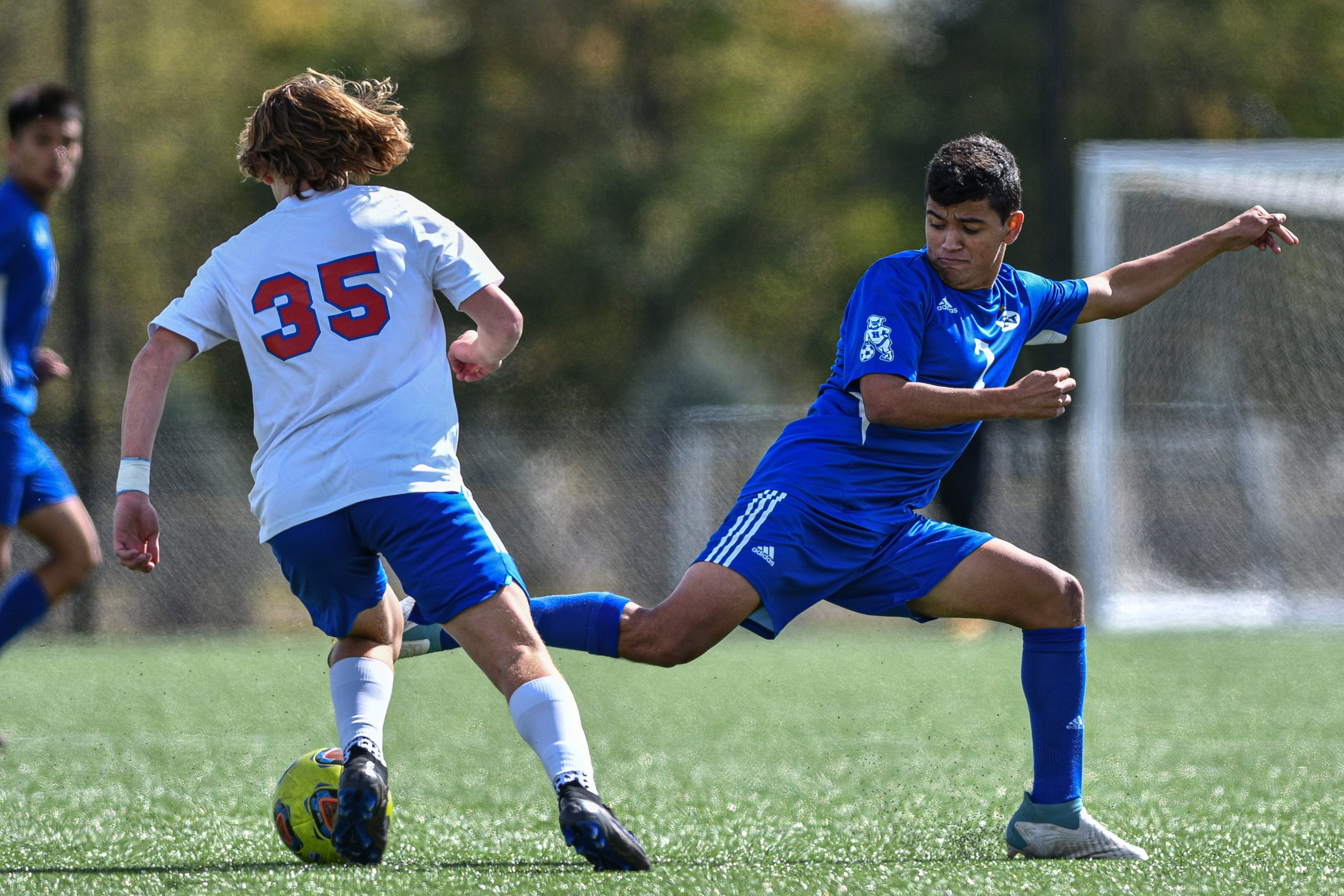Ronalli’s Christian Blaser, right, blocks a low cross attempt by Columbus North’s Nico Gotoh during a sectional final soccer match between Columbus North and Roncalli at the BCSC Soccer Complex in Columbus, Ind., Saturday, Oct. 7, 2023. Caldeon received a red card and had to sit out the rest of the match. North defeated Roncalli 4-2 to win the sectional title.