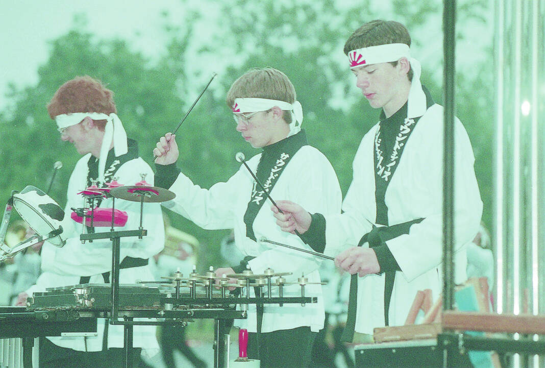 From left, Tyler Munn, Vincent McKinney and Nathan Kaleta, played with the Sound of North Band during the Indiana State School Music Association district marching band contest hosted by Columbus East High School in 1998.