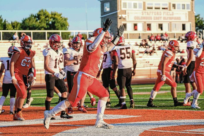 Columbus East’s Caaden Gault celebrates after scoring a touchdown against New Albany at Columbus East High School in Columbus, Ind., Friday, Sept. 15, 2023.