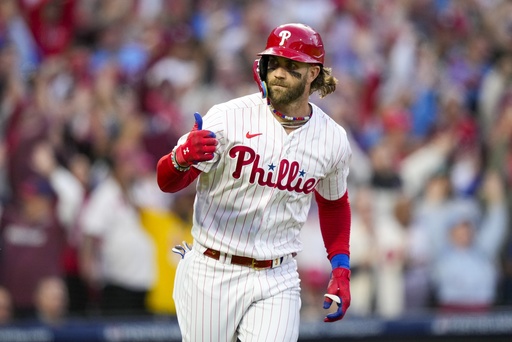 PHILADELPHIA (AP) — Bryce Harper has manhandled postseason pressure with the ease of one of his swings — bat tucked behind his helmet, short ground step, then, whack! — against a slider.
