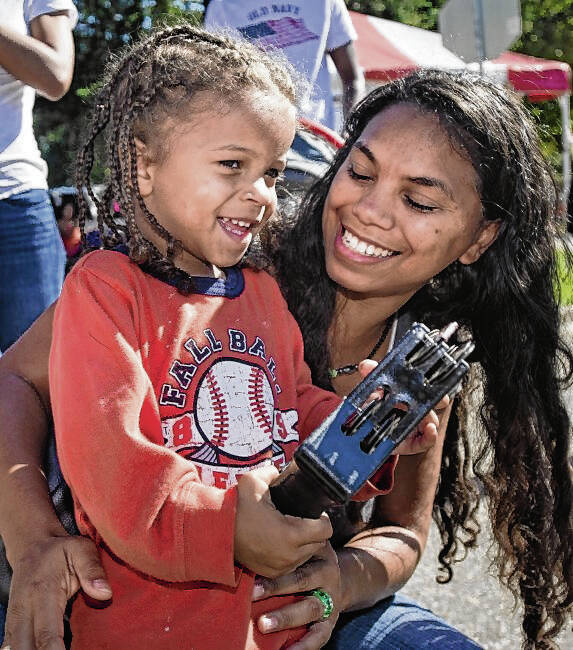 Aidyn Horne demonstrated his tambourine-playing talent to his mother, Sussette Lawson, during the Steel Pan Kid Jam at Ethnic Expo on 2013.