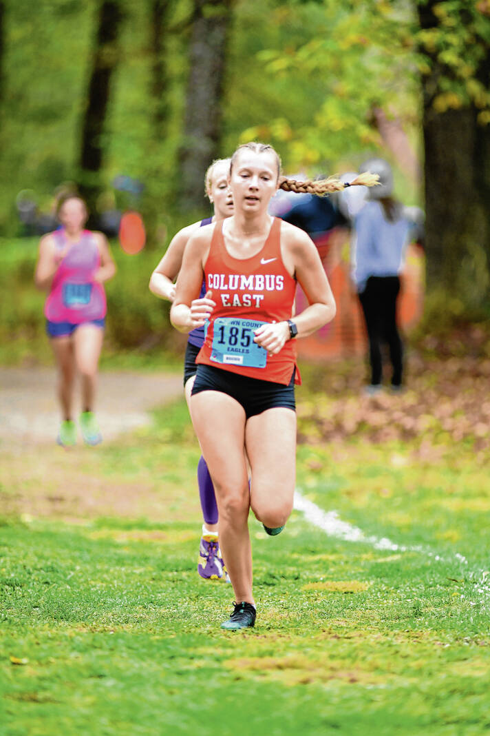 Columbus East finished 10th with 264 points and advanced two individuals — Jackson Brookes, who took 28th in 17:57.0, and Austin Menefee, who was 37th in 18:34.5. Also for the Olympians, Elijah Clore finished 60th (20:00.4), Chance Knapp 68th (20:30.0), Alex Weatherford 74th (21:02.9), Ezekiel Weatherford 77th (21:42.3) and Stillman Whittington 78th (21:11.1).