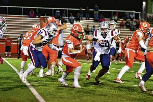 Columbus East’s Kyson Villarreal looks for room to run against Bedford North Lawrence’s Gibson Crane (36) and Kline Woodward (50) Friday at Columbus East High School.