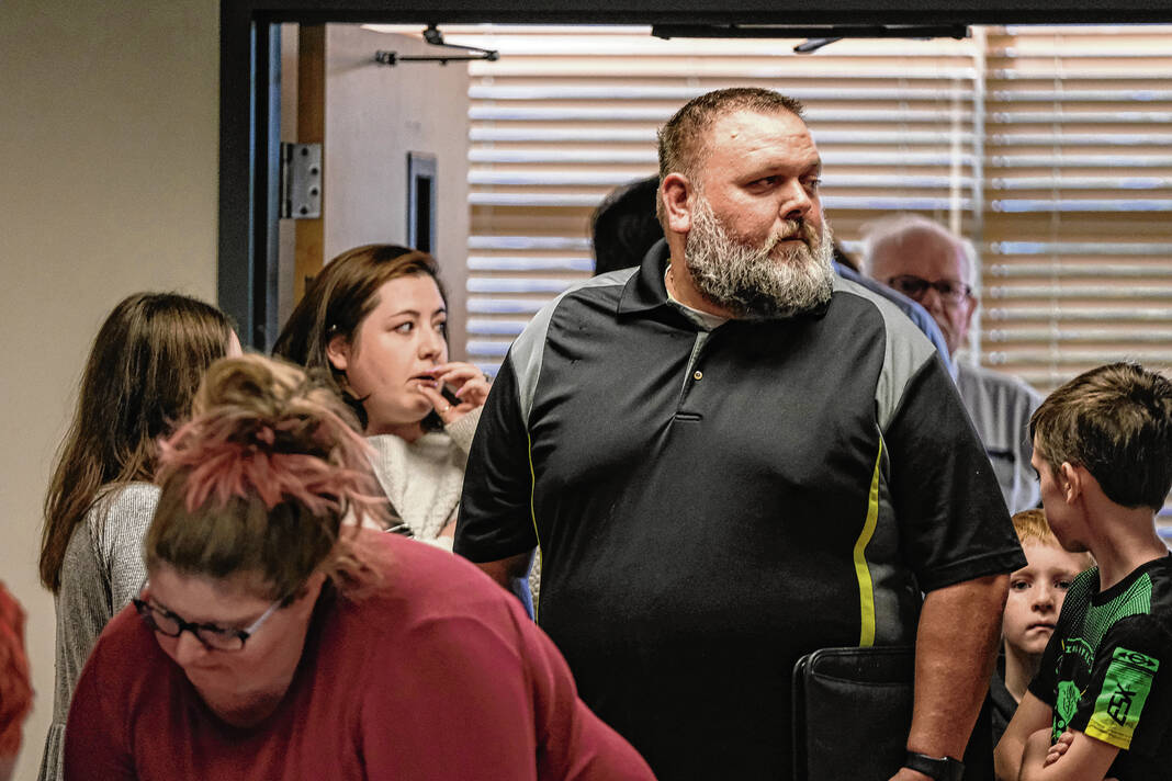 Mike Wolanin | The Republic Sean Burton, candidate for Columbus Mayor, waits in line to check in for the Put People First Town Hall by the local chapter of Hoosier Action at St. Paul’s Episcopal Church in Columbus, Ind., Monday, Oct. 9, 2023. Members of the public listened to and engaged with candidates for city council and mayor about issues facing people living in Columbus.