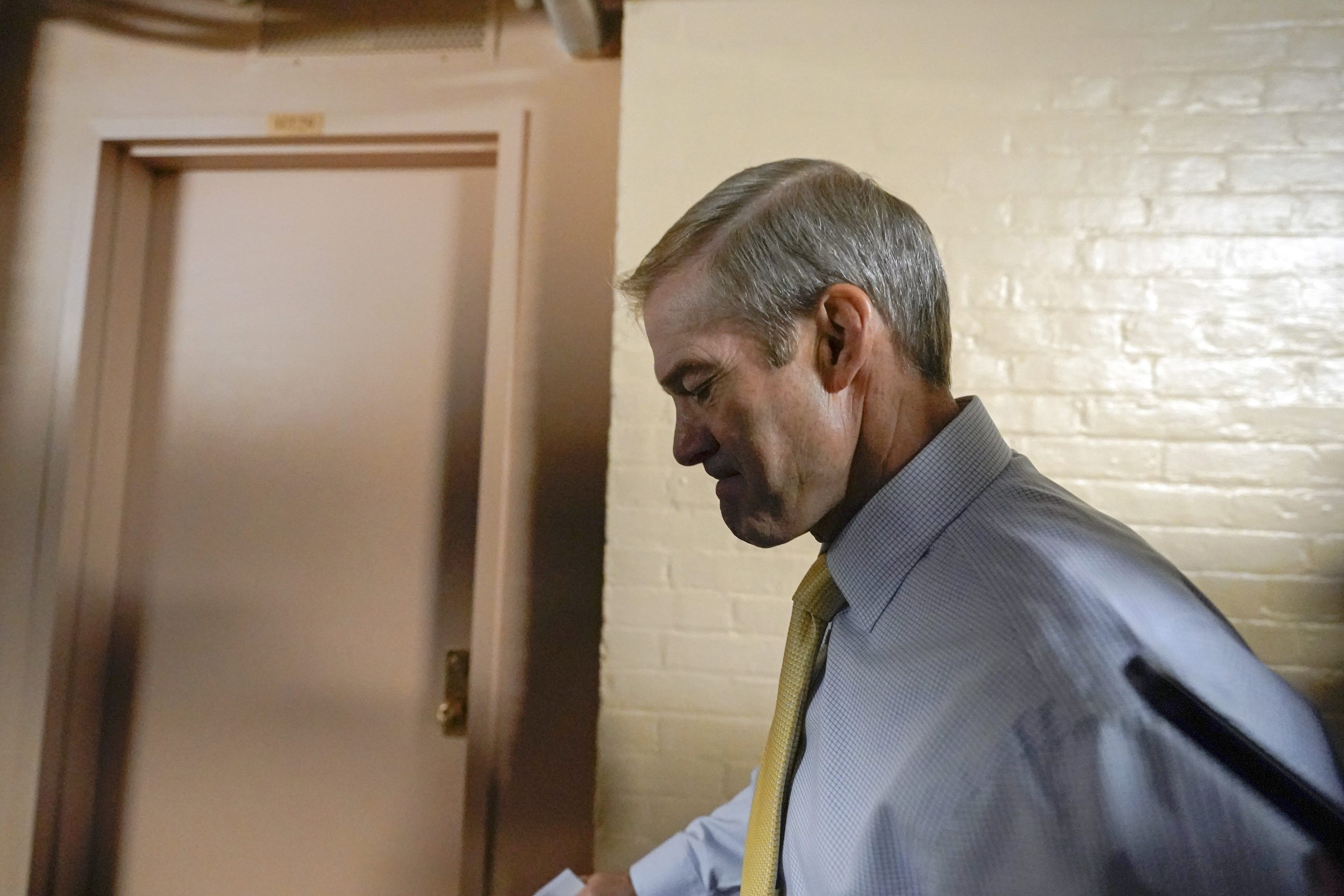 Rep. Jim Jordan, R-Ohio, chairman of the House Judiciary Committee, arrives for the Republican caucus meeting at the Capitol in Washington, Thursday, Oct. 19, 2023. (AP Photo/Alex Brandon)