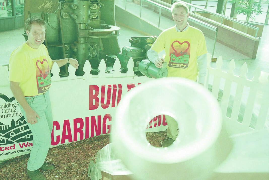 Cummins engineers Matt Smith, left, and David King designed and built a devise based on “The Price is Right” game show to collect pennies tossed into the water at the base of Chaos at The Commons during the United Way fund drive in 1998.