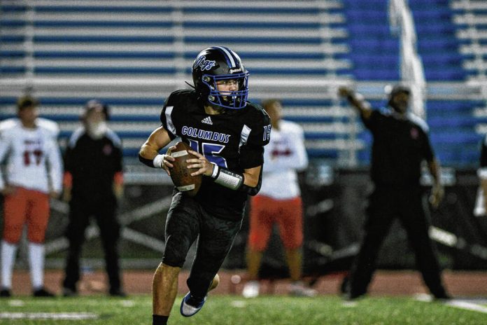 Columbus North’s Asher Ratliff looks downfield to pass against Terre Haute South Oct. 13 at Columbus North.
