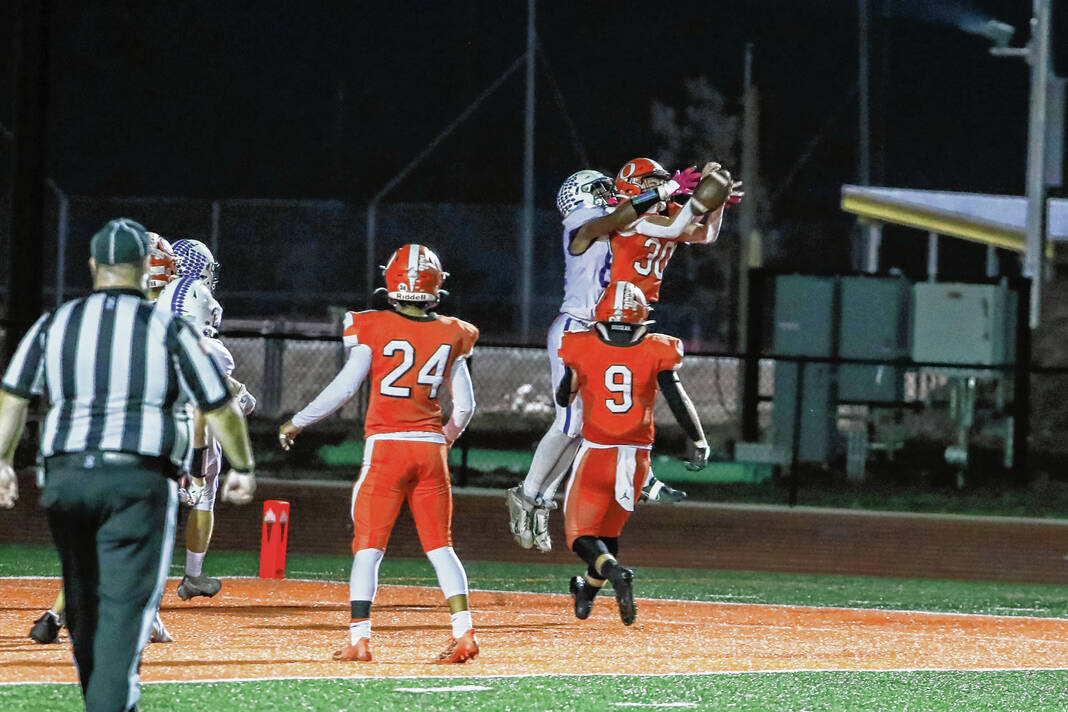 Columbus East’s Nate Anderson breaks up a pass in the end zone during the sectional opener against Seymour Friday at Columbus East.