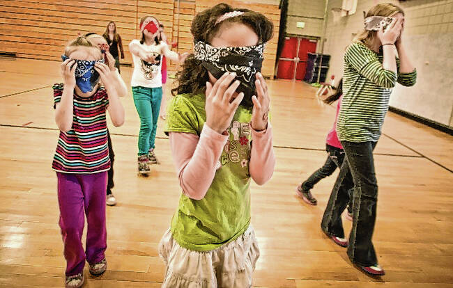 Angelina McCray, front, and others put on blindfolds to experience walking as a blind person during an i-CARE exercise at Schmitt Elementary School in 2013.