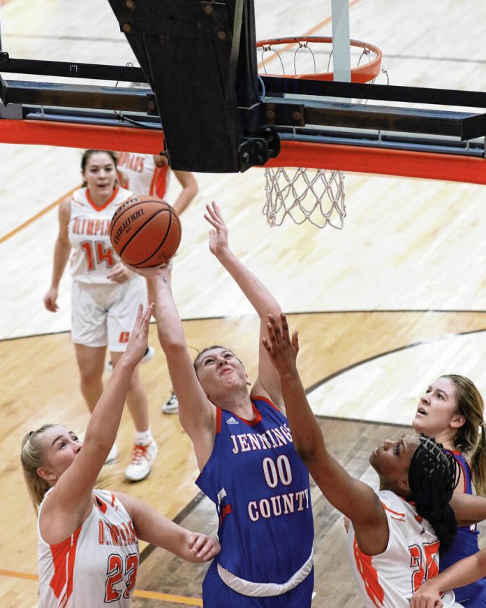 Jennings County’s Juliann Woodard shoots a layup while being guarded by Columbus East’s Leah Bachmann, left, and Messiah Trapp Jan. 19 at Columbus East.
