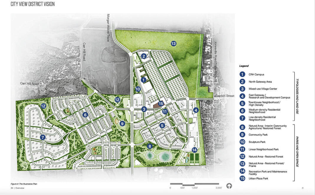 In addition to an approximately 100-acre CRH campus on the northeast side of the site, the City View District Plan includes residential neighborhoods, commercial centers and a research and development campus. These areas would be connected to each other and nature via “open spaces, green corridors, and amenities that extend throughout the property,” officials said.