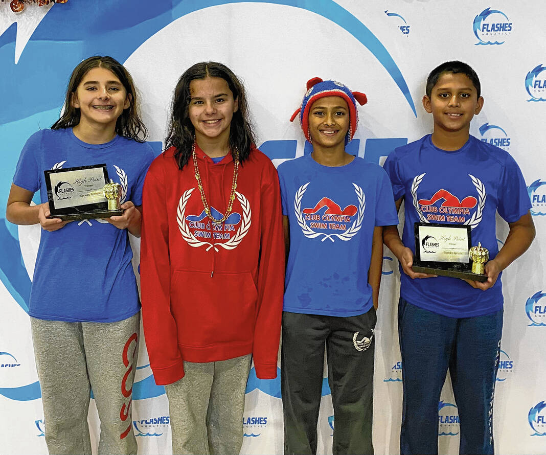 Four Club Olympia swimmers won High Point Awards at last weekend’s “Spooky Sprints” at Franklin Central. Pictured from left are Camila Mejia Murguia (first place, 11-12 girls), Rebeca Mejia Murguia (third place, 11-12 girls), Shreyan Kulkarni (second place, 11-12 boys) and Aahan Gupta (first place, 10U boys).