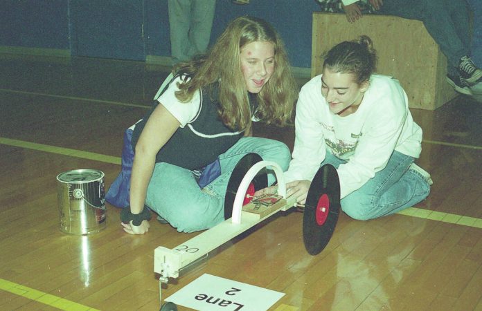 Kylie Freeman, left, and Sarah Martin, physics students at Columbus North High School, tested their handmade vehicle in the annual Mouse Trap/Rat Trap Race in 1998.